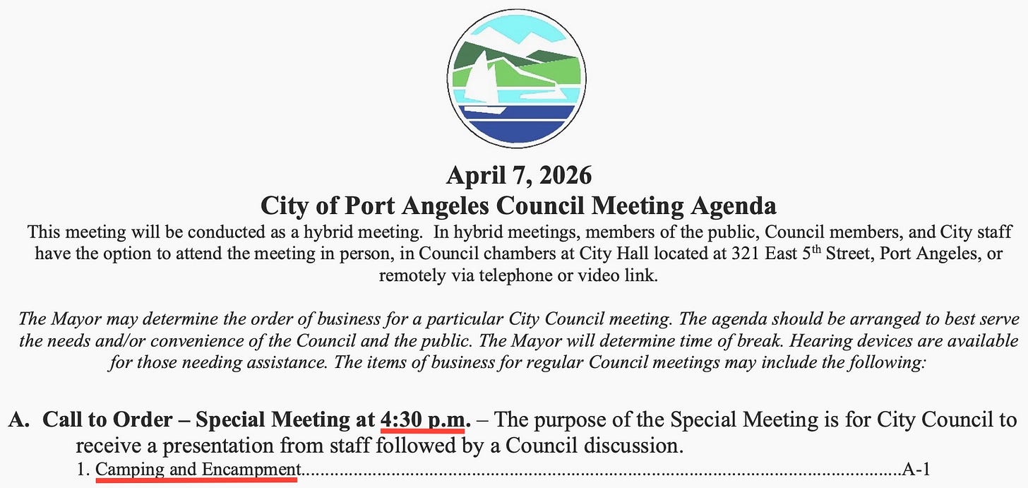 This afternoon at 4:30 p.m., the Port Angeles City Council will hold a special meeting to discuss “Camping and Encampment.”