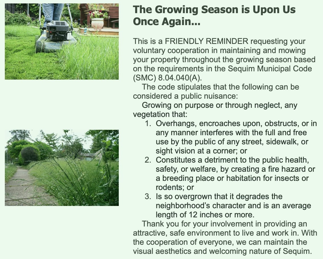 The City of Sequim is reminding residents to keep their lawns mowed—warning that overgrown grass may be deemed a public nuisance if it obstructs sidewalks, threatens public health or safety, attracts rodents, or diminishes neighborhood character.