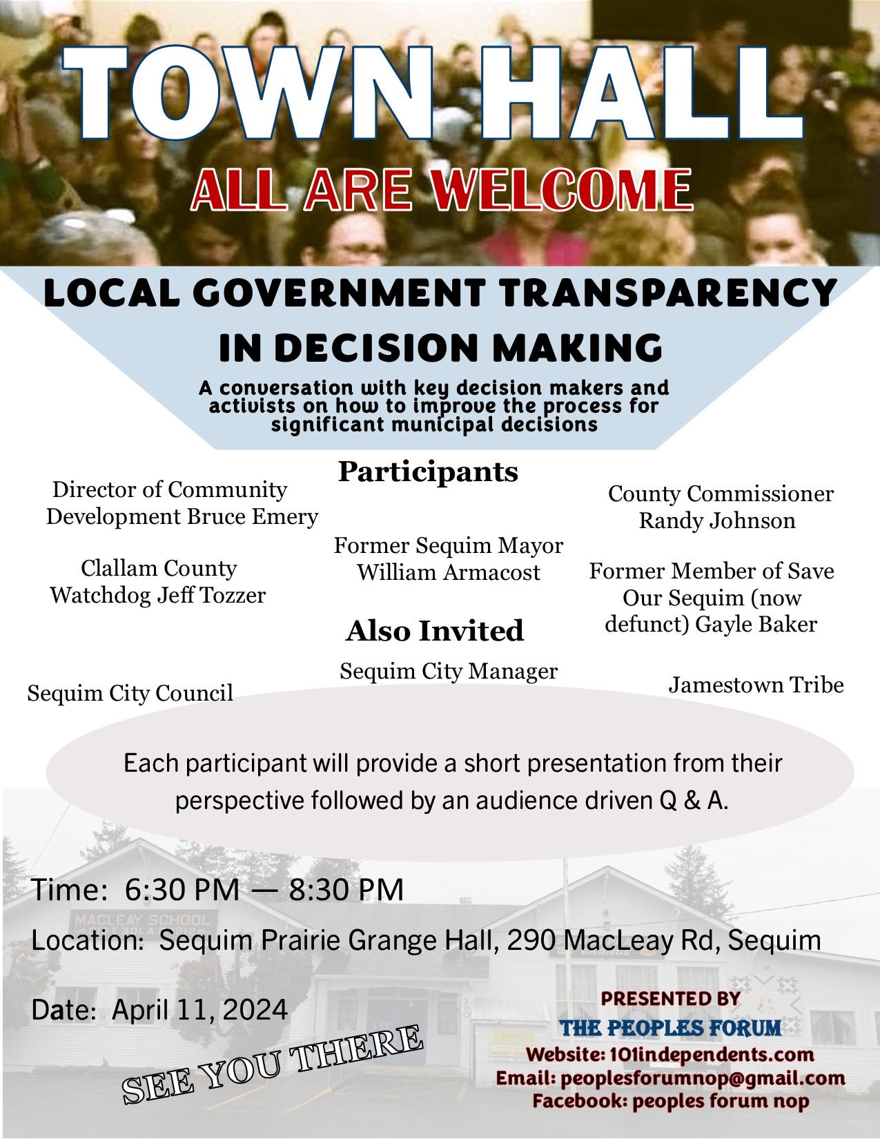 Clallam County Watchdog Jeff Tozzer will be participating in April’s “Town Hall: Local Government Transparency in Decision Making” hosted by the People’s Forum.