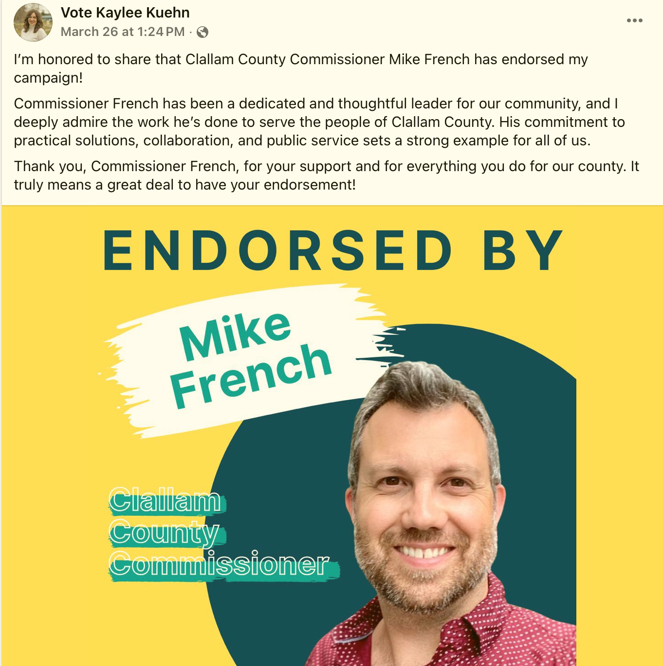 State candidate Kaylee Kuehn has secured an endorsement from Commissioner Mike French, praising his leadership and commitment to public service.
