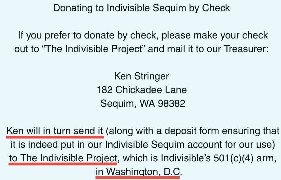 But there’s a catch: contributions are routed through The Indivisible Project in Washington, D.C., before (they say) returning to local efforts.