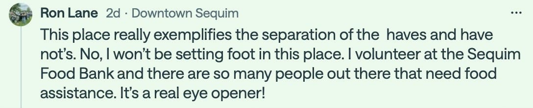 One commenter argued it represents the divide between “haves and have-nots.” This, from someone affiliated with the local food bank—an organization with no income limits, where luxury vehicles regularly line up for free groceries.