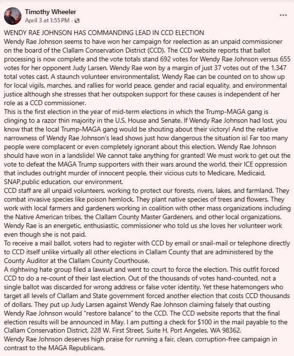 Local activist Tim Wheeler took to Facebook to frame the Clallam Conservation District election as something far bigger than conservation.
