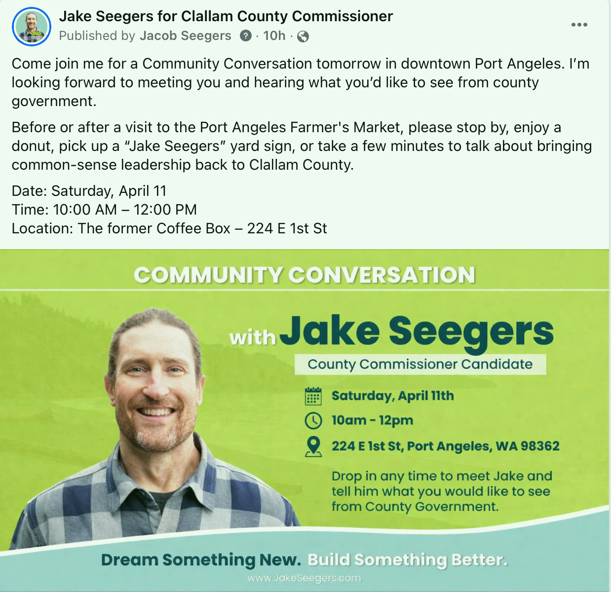 Jake Seegers’ campaign is picking up steam. Yard signs have arrived, and he’s hosting a casual meet-and-greet this morning from 10 a.m. to 12 p.m. at 224 E 1st Street—the former Coffee Box.