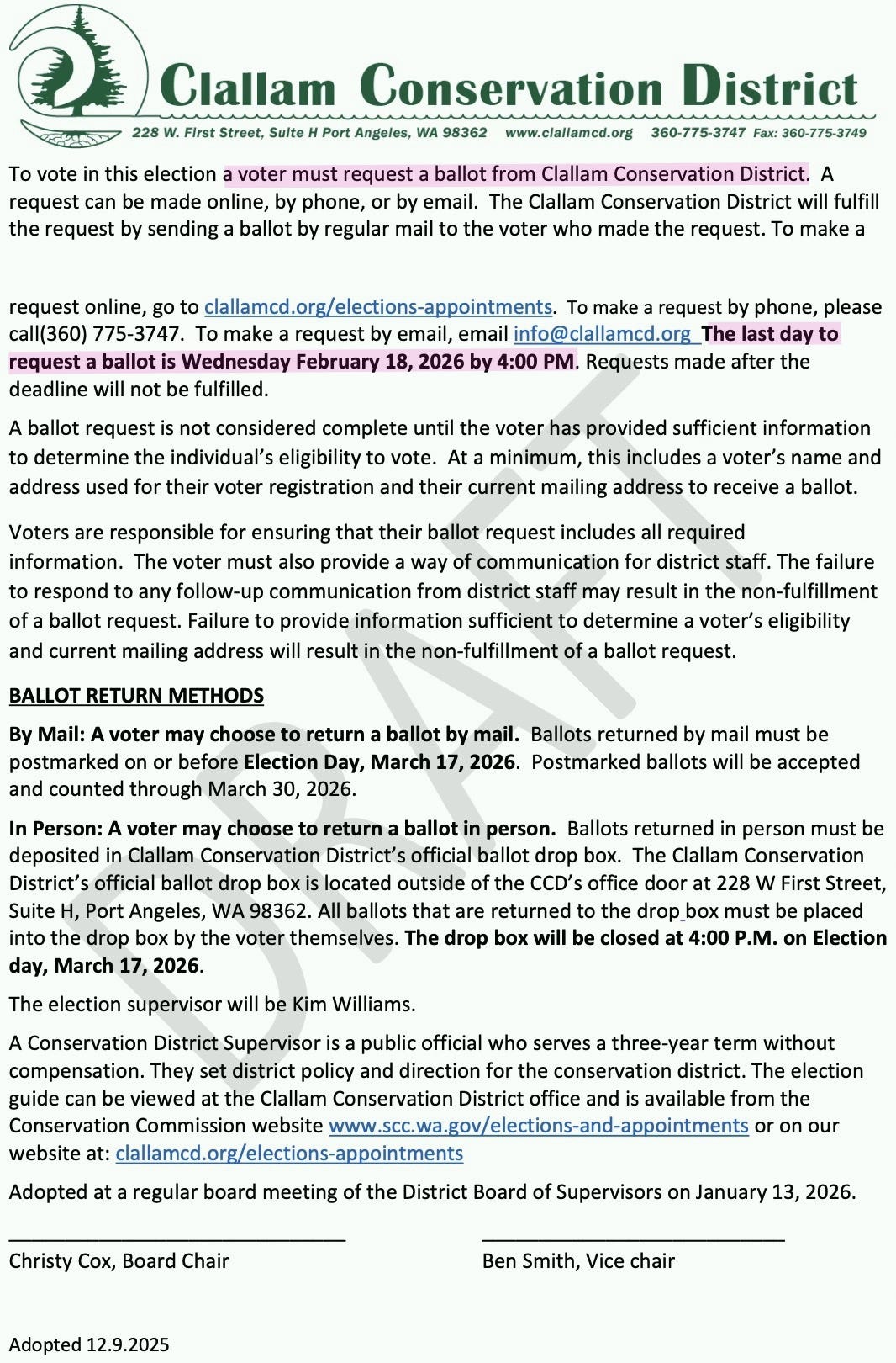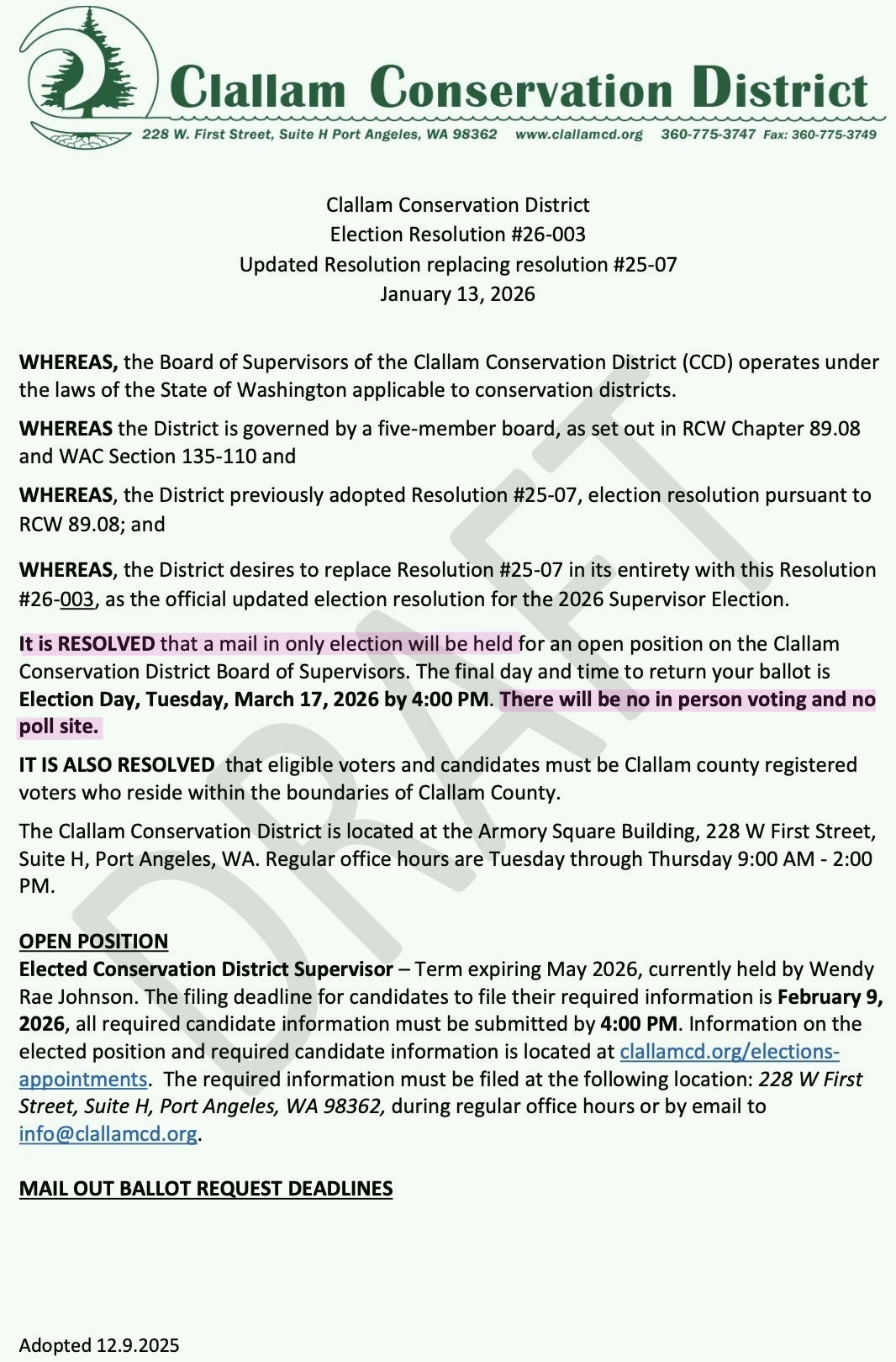 The CCD also announced that the State Conservation Commission will not appeal the Thurston County ruling that voided the 2024 election. The CCD board opposed that decision, with Chair Christy Cox insisting everything the District did was “legal.”