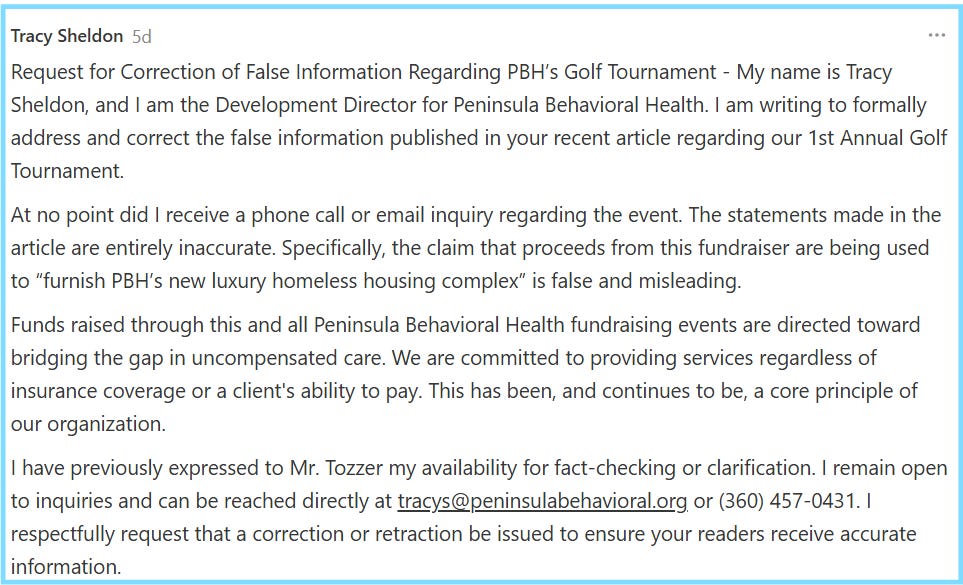 Last week, I got something wrong. I reported that Peninsula Behavioral Health’s (PBH) October charity golf tournament might help furnish its new North View permanent supportive housing complex in Port Angeles — a taxpayer-funded project that includes EV charging stations, solar panels, panoramic views, a rooftop terrace, and even a dog-washing station.