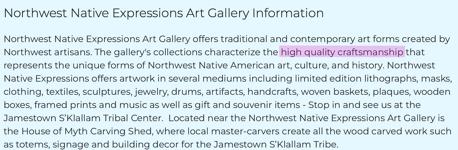 The Jamestown S’Klallam art gallery praises the “high quality craftsmanship” of its collections.