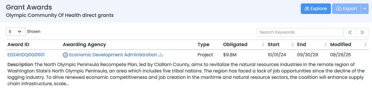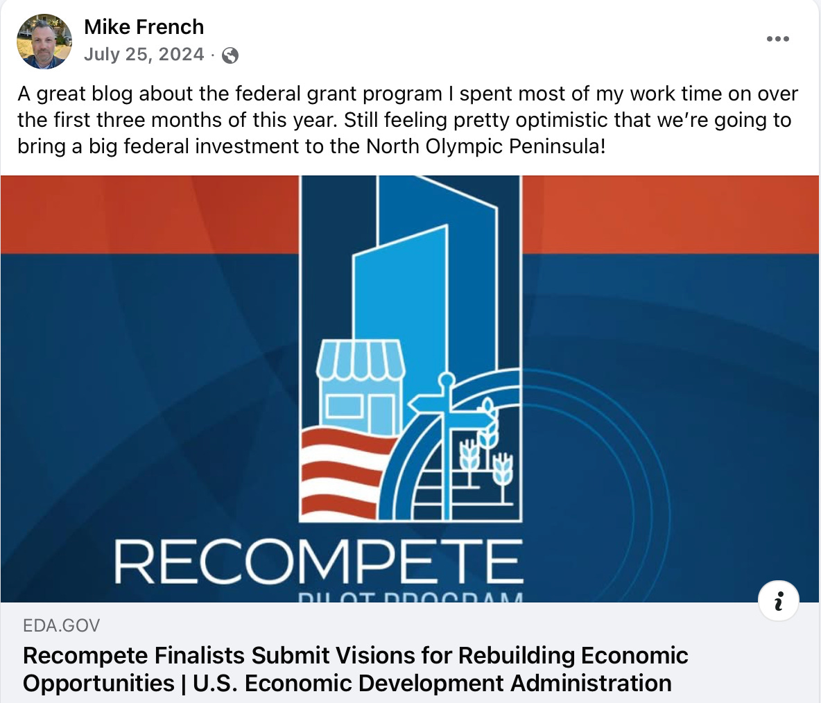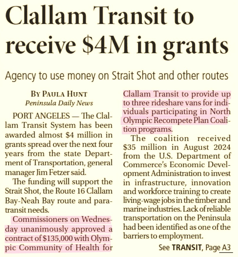 The $35 million Recompete grant was sold to the public as a once-in-a-generation workforce revival for the North Olympic Peninsula—a plan to rebuild timber, maritime, and natural-resource jobs. One year in, the results are hard to find. What is easy to find is the money: flowing through favored NGOs, hidden behind closed-door agreements, stripped of measurable outcomes, and championed by the same elected officials who promised transparency. At the center of it all sits Olympic Community of Health—and Commissioner Mike French.