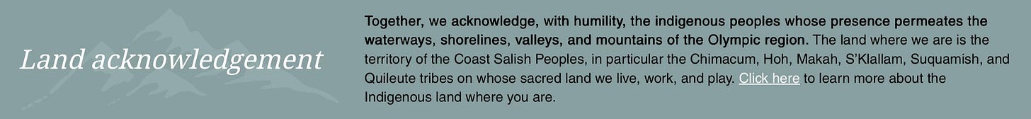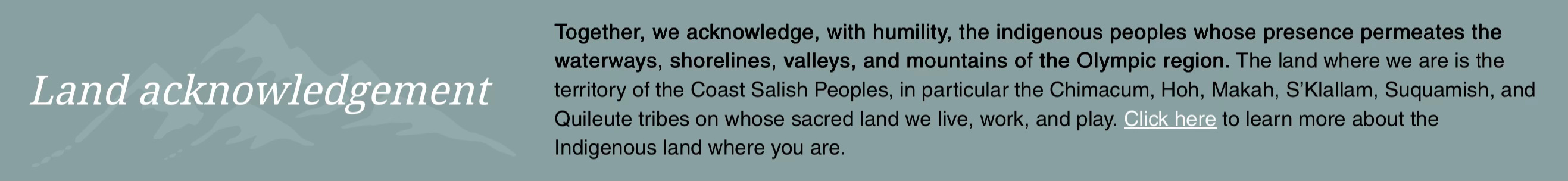 Together, we acknowledge, with humility, the indigenous peoples whose presence permeates the waterways, shorelines, valleys, and mountains of the Olympic region. The land where we are is the territory of the Coast Salish Peoples, in particular the Chimacum, Hoh, Makah, S’Klallam, Suquamish, and Quileute tribes on whose sacred land we live, work, and play. Click here to learn more about the Indigenous land where you are.