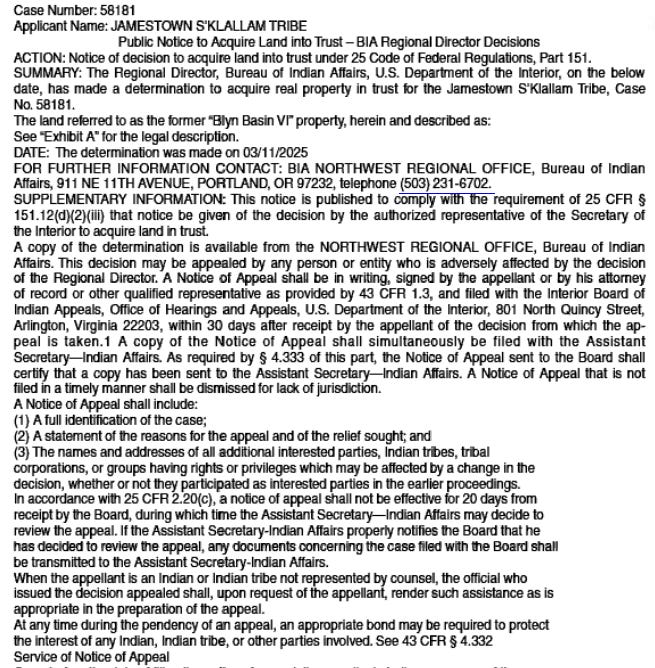 An important matter that directly impacts the future of our community requires your attention. The Bureau of Indian Affairs (BIA) has approved the acquisition of six parcels of land for trust status as requested by the Jamestown Tribe. This conversion will permanently remove $21,328 in annual property tax revenue from the county and state tax rolls. As a result, vital funding for schools, libraries, emergency services, roads, county services, and veterans’ relief will be further reduced. This transfer of financial responsibility to other taxpayers exacerbates the already pressing housing affordability crisis.