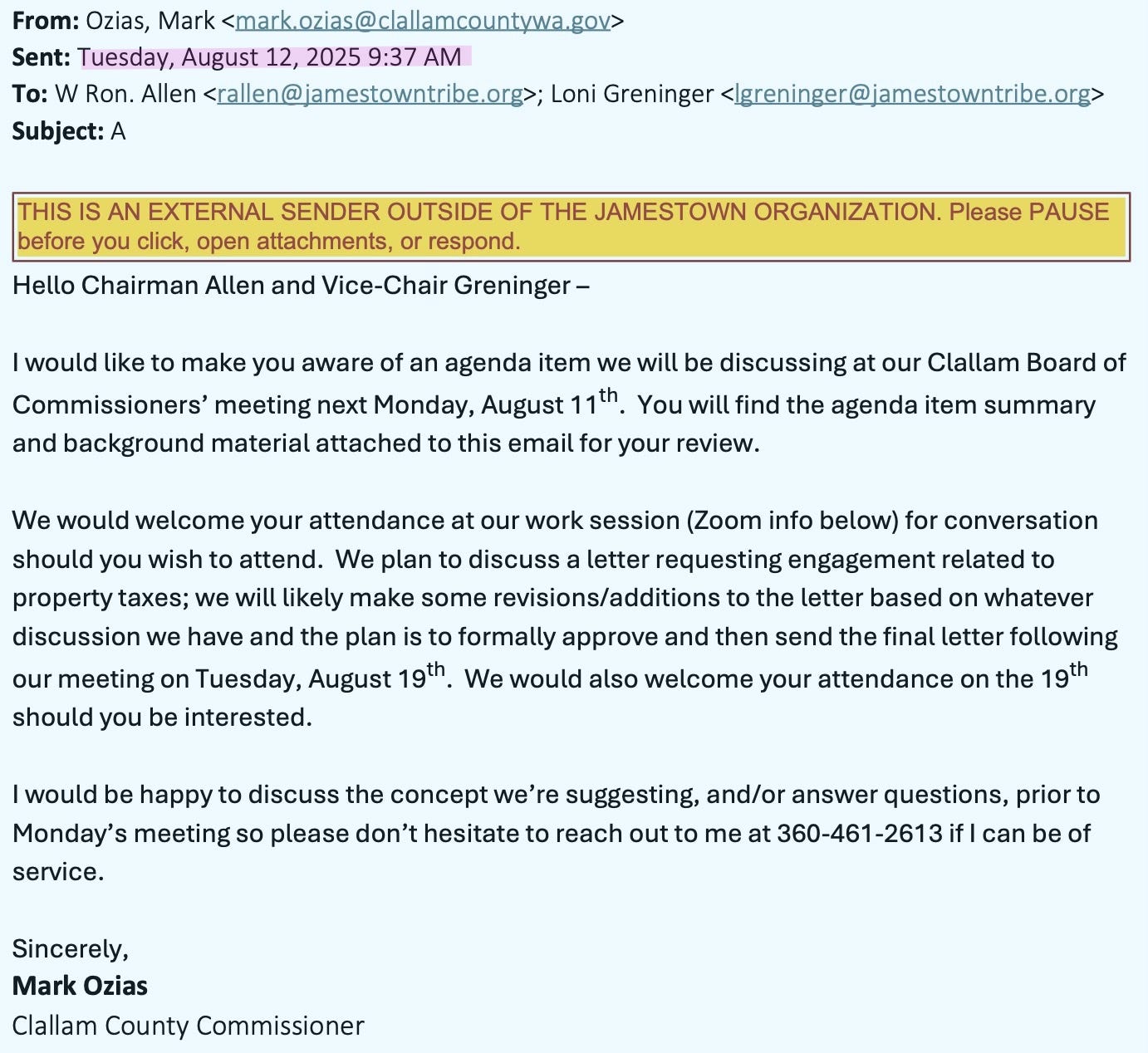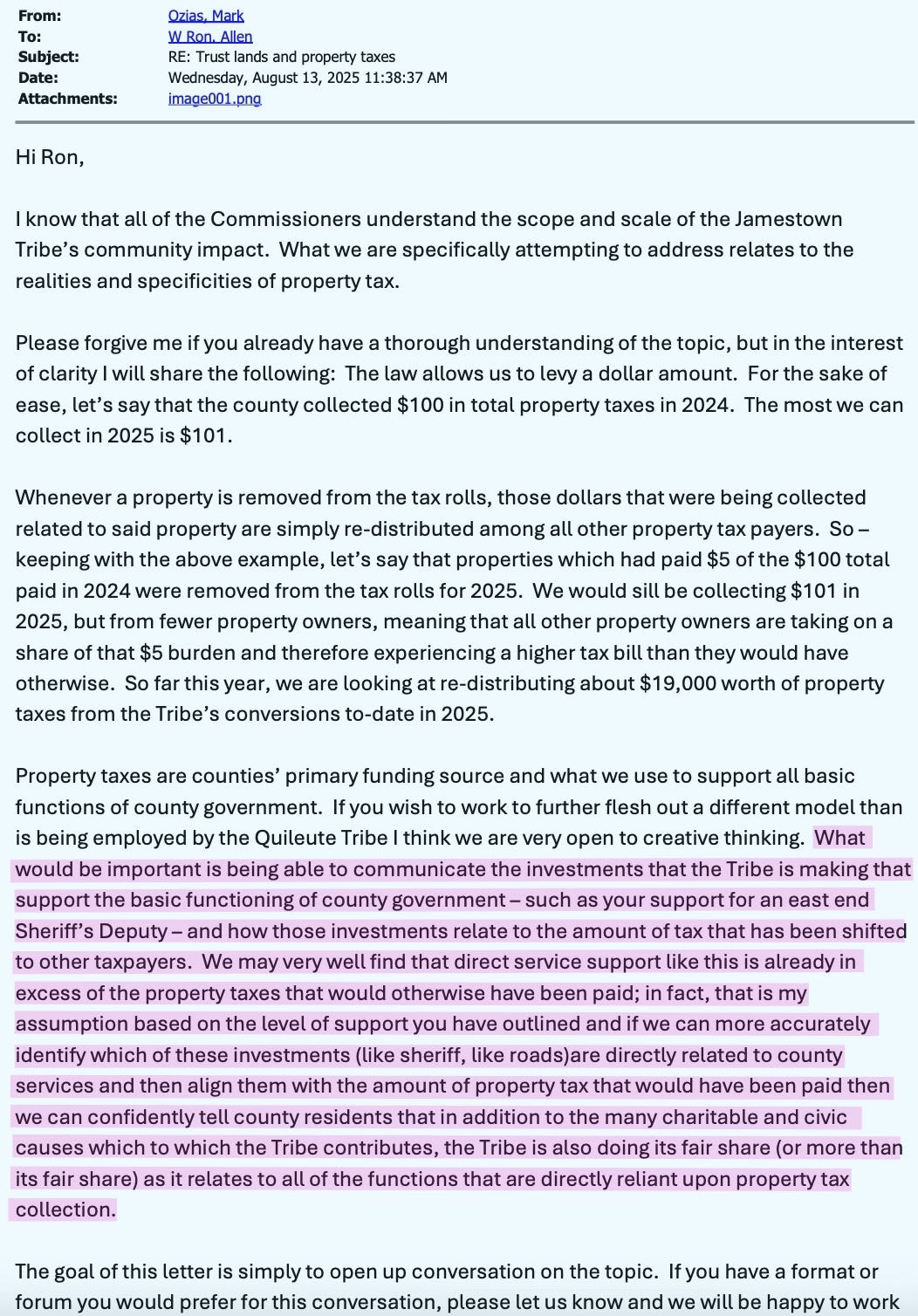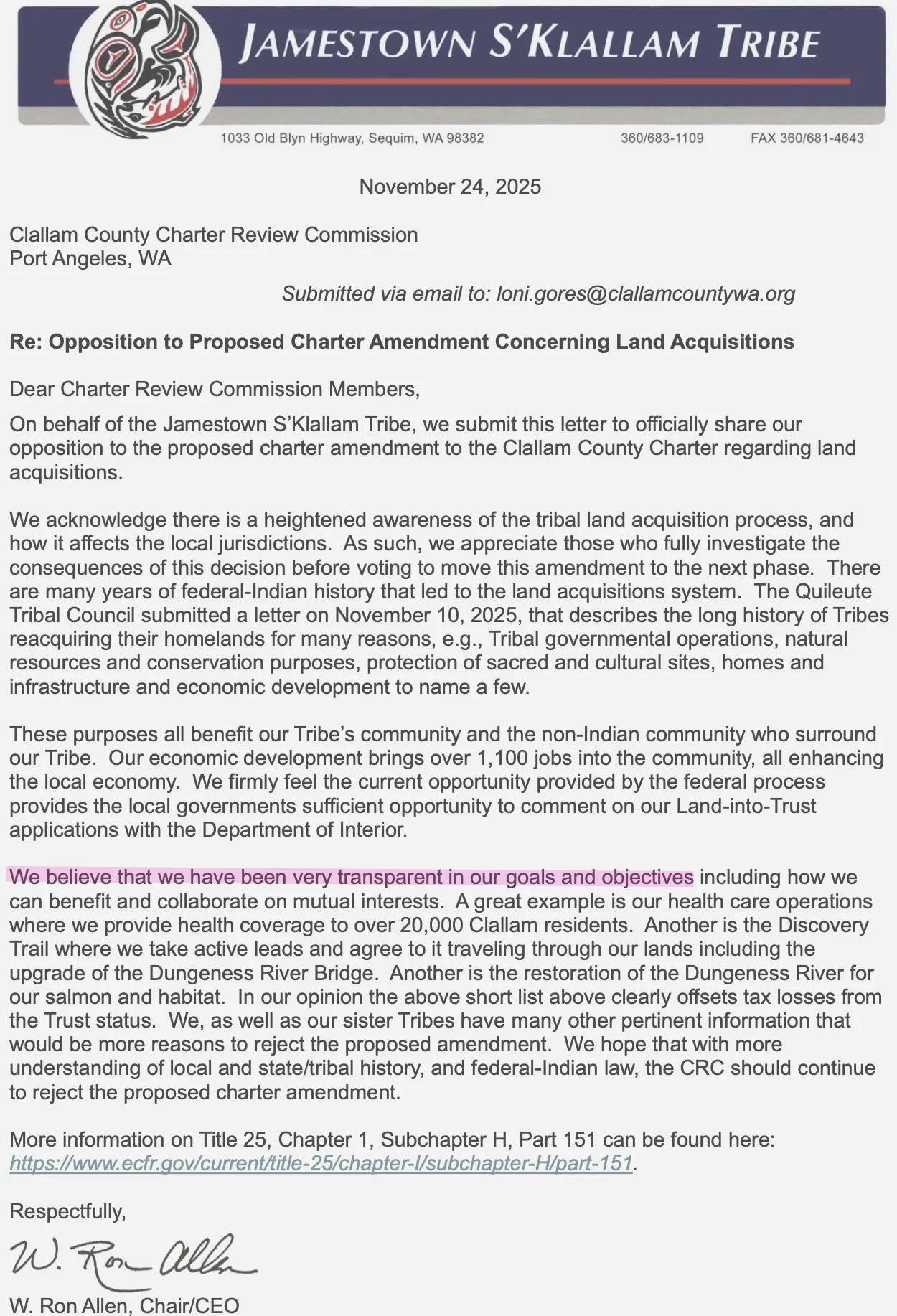 The much-discussed letter—first floated in January, then finally sent in August—was not simply a request for discussion. It included a clear statement that Commissioners Ozias, French, and Johnson “support the Jamestown S’Klallam Tribe’s work to create a landbase.”