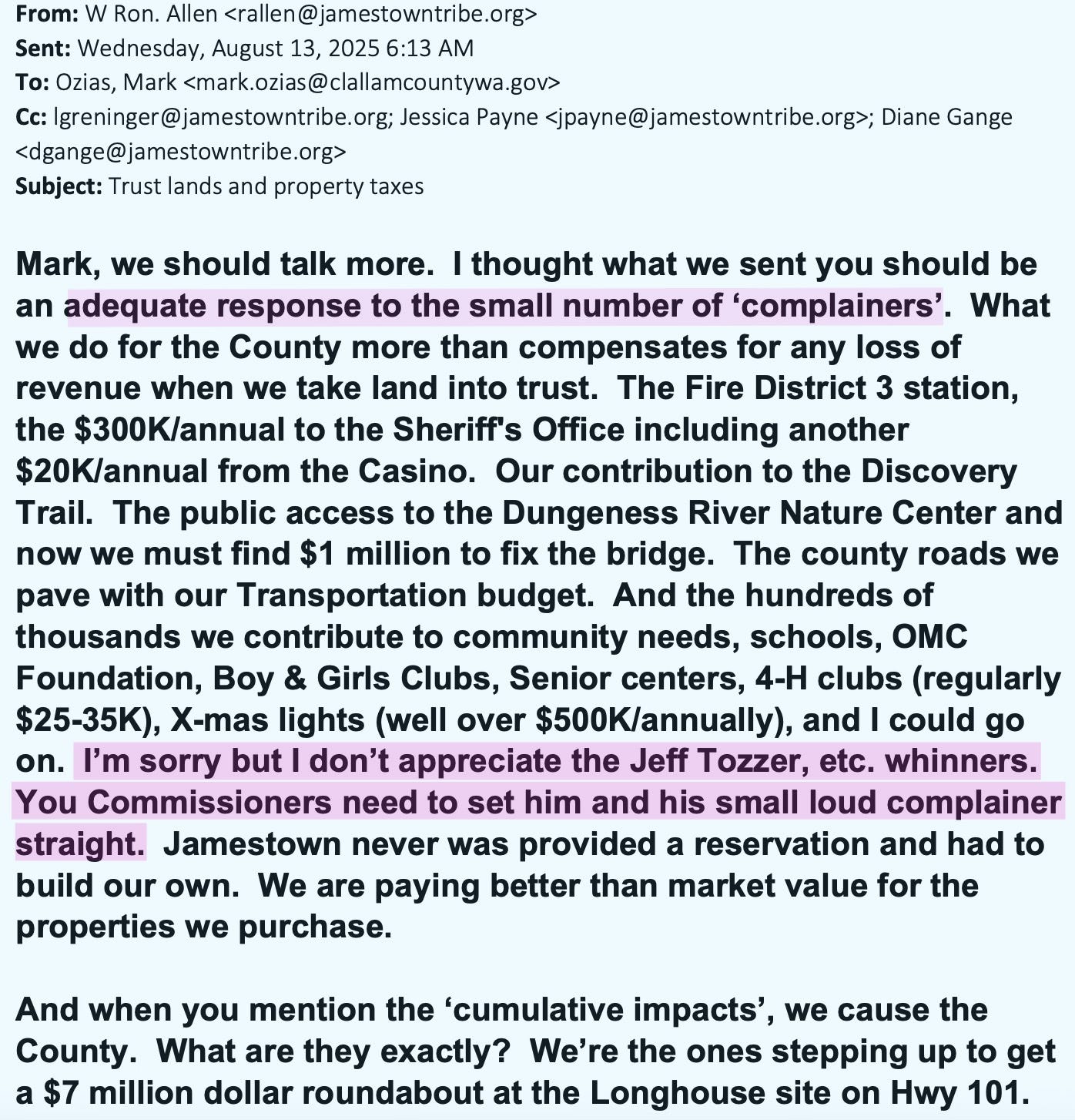 When citizens asked whether a powerful corporation should contribute fairly to county services, they expected their elected officials to advocate on their behalf—not quietly side with the donor who called them “complainers.” Newly obtained public records reveal how Commissioner Mark Ozias responded when Jamestown Corporation CEO Ron Allen dismissed tax concerns, demanded critics be “set straight,” and argued that voluntary contributions should substitute for mandatory taxes. The emails expose a deeper problem: Clallam County has lost representation, and a leader of a sovereign nation is instructing a county commissioner how to handle his own constituents.