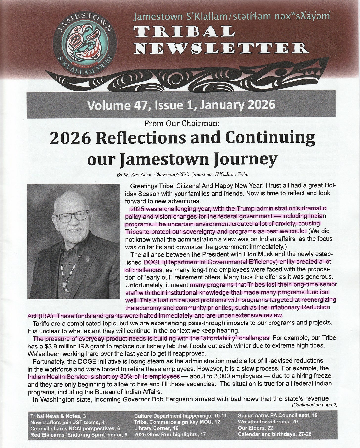 In the January 2026 Jamestown tribal newsletter, Chairman Ron Allen reflects on what he describes as a difficult year navigating the federal government. He cites challenges tied to “Indian programs,” uncertainty caused by DOGE-related federal disruptions, the loss of senior staff within agencies, halted grants, and extensive program reviews.