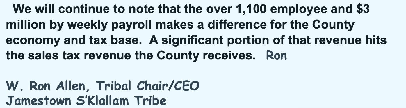 Employment and sales tax are not substitutes for property tax. Every large employer contributes to the economy. That does not exempt them from paying into the systems that support courts, jails, elections, and land-use enforcement. Additionally, other businesses operate under Washington State law which mandate paid maternity leave, the Jamestown Corporation does not.