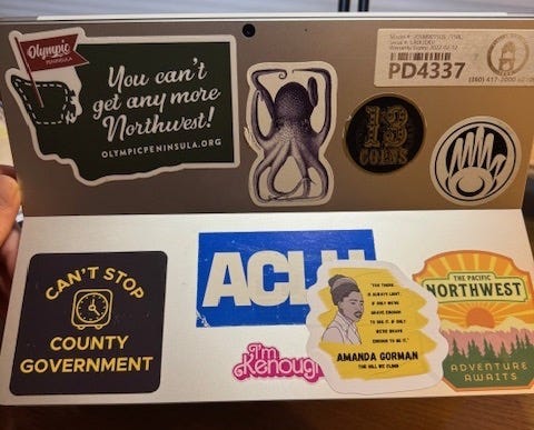 The problems aren’t limited to browsing habits. Commissioners French and Ozias’ laptops — taxpayer-owned property — are covered in stickers, some with overt political messages.