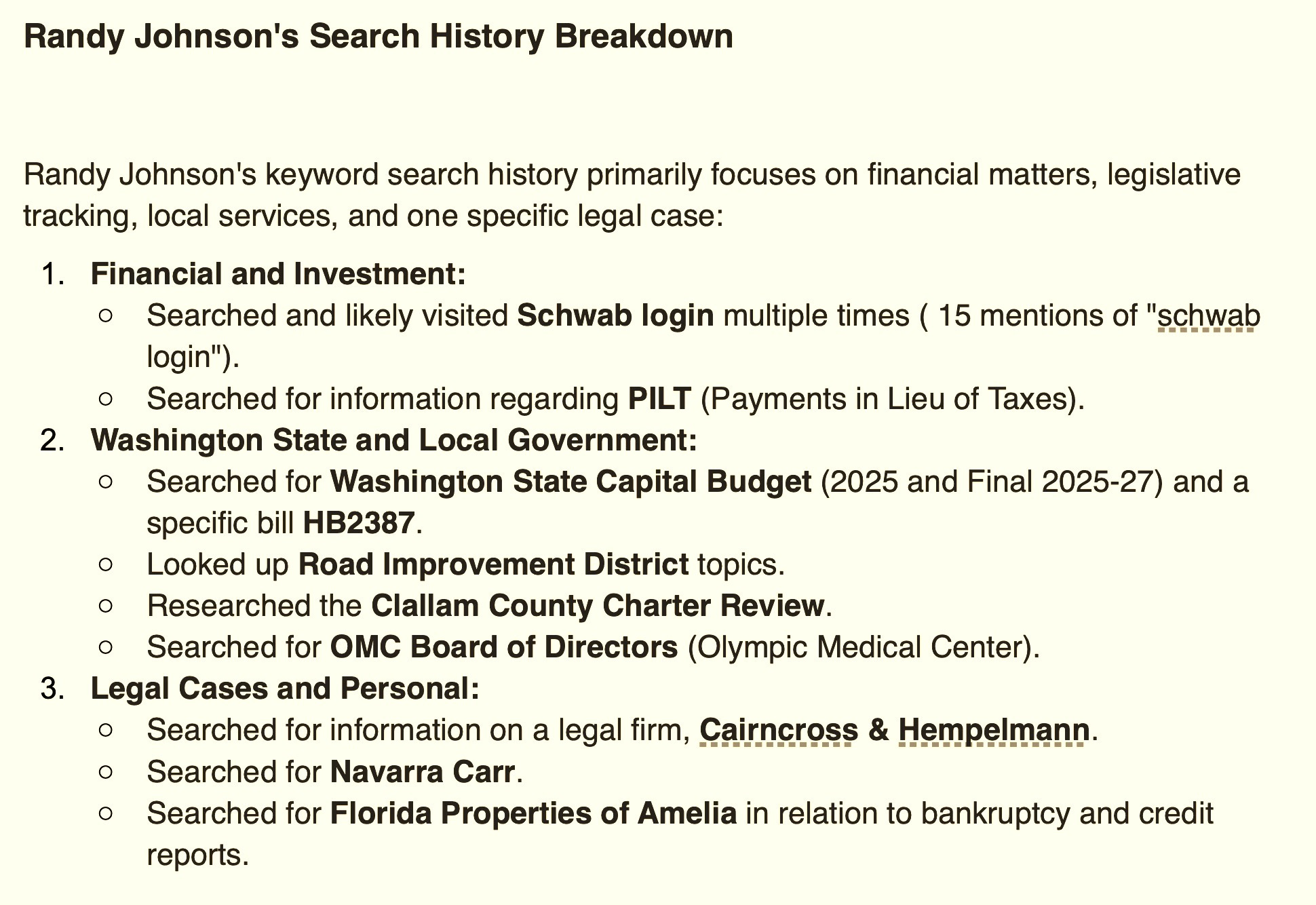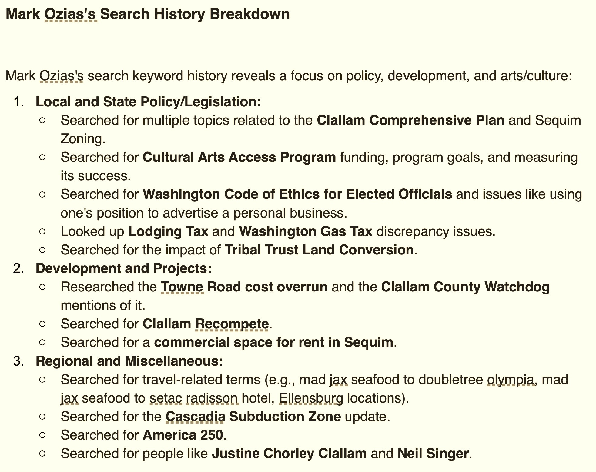 But one line stands out: multiple searches for “Clallam County Watchdog” — this very publication. Commissioner Ozias, it seems, wanted to know what citizens were saying about him.