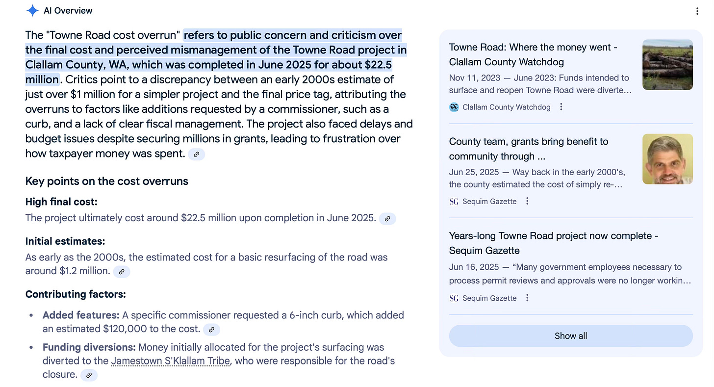 He also searched “Towne Road cost overrun” and “Clallam Recompete”, perhaps to stay ahead of growing criticism of the county’s spending practices.