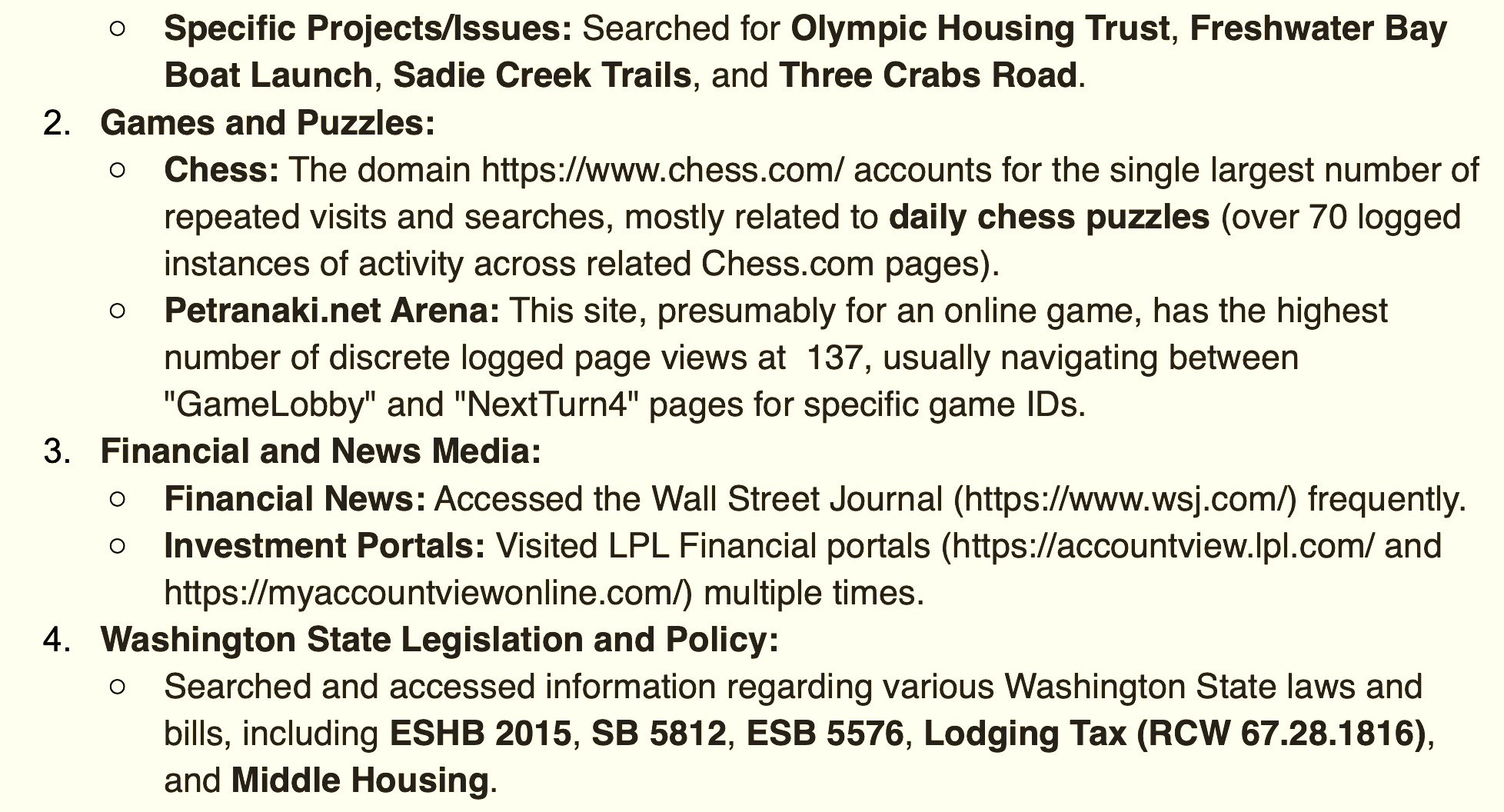 Commissioner Mark Ozias’s browsing is a mix of legitimate research and revealing curiosity. His search terms included “Cultural Arts Access Program funding,” “Sequim zoning,” “Clallam Comprehensive Plan,” and “Lodging Tax discrepancies.”