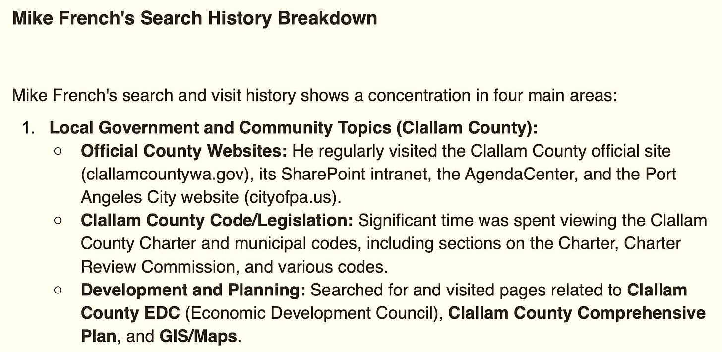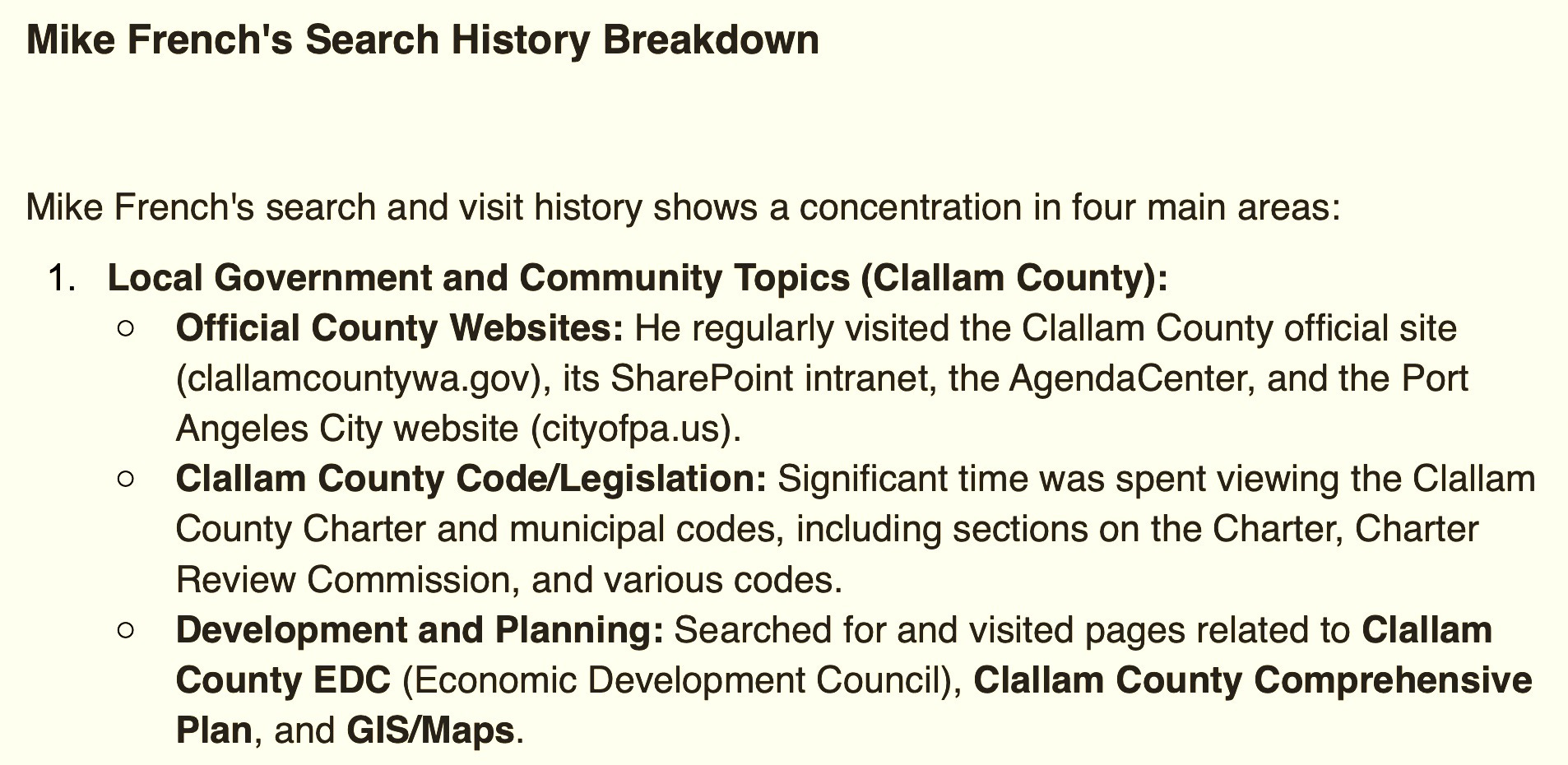 To be fair, French also viewed legitimate county sites, such as clallamcountywa.gov and the Charter Review Commission page. But the balance between gaming and governance raises questions.
