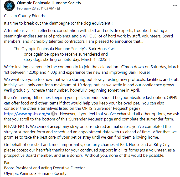 This Saturday, after “intensive self-reflection,” the Olympic Peninsula Humane Society will be holding an Open House at its reopening Bark House: