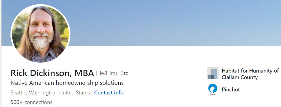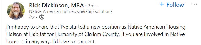 CC Watchdog: I heard Rick Dickinson is leaving the Center for Inclusive Entrepreneurship to be the Native American Housing Liaison for Habitat for Humanity. Is that for your Clallam County division of HFH? If so, could you share the job description for that position?