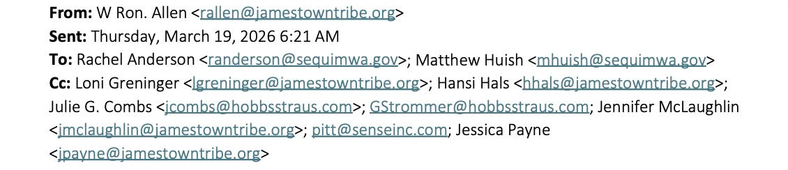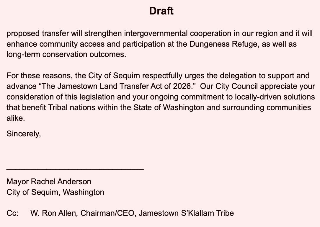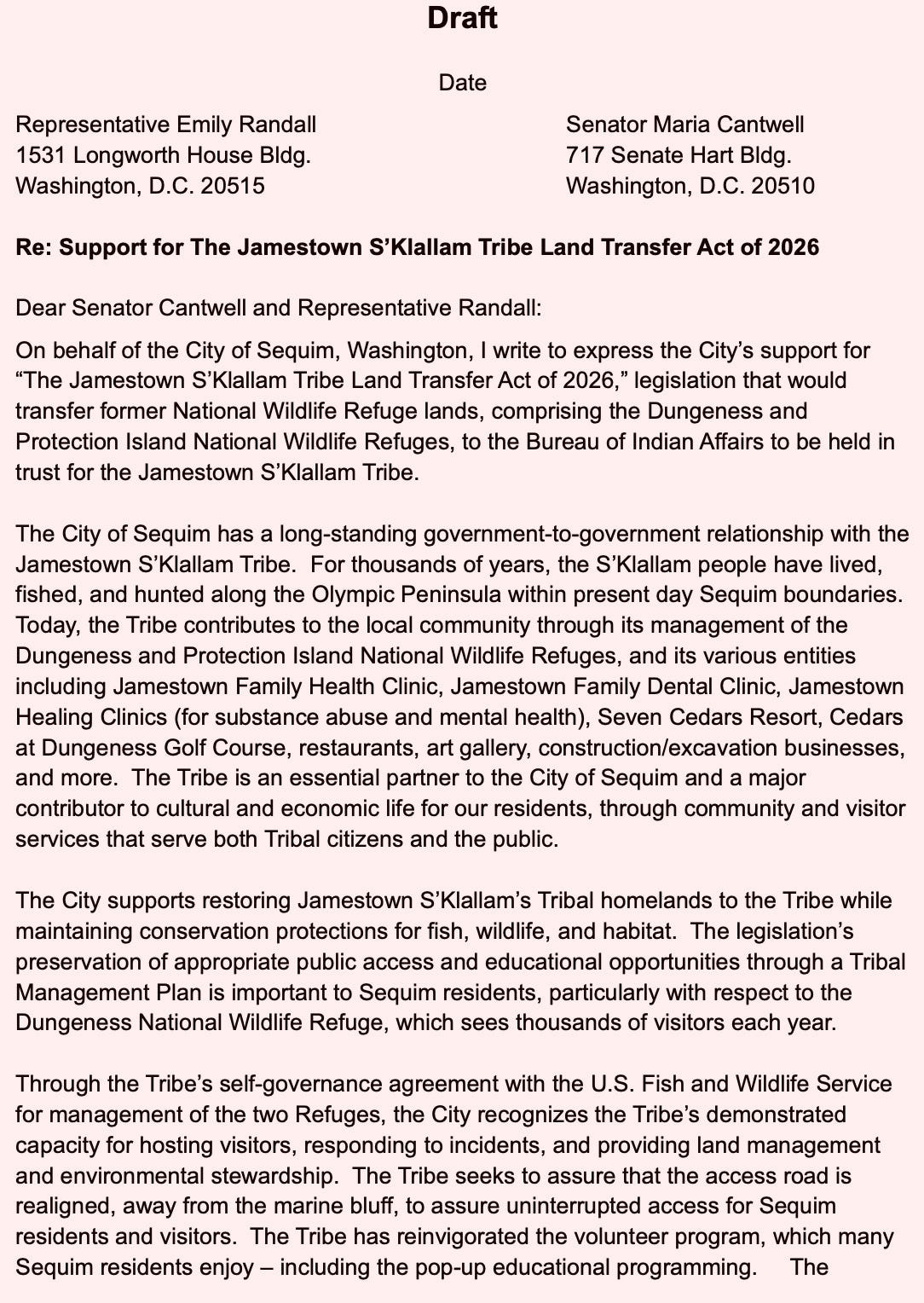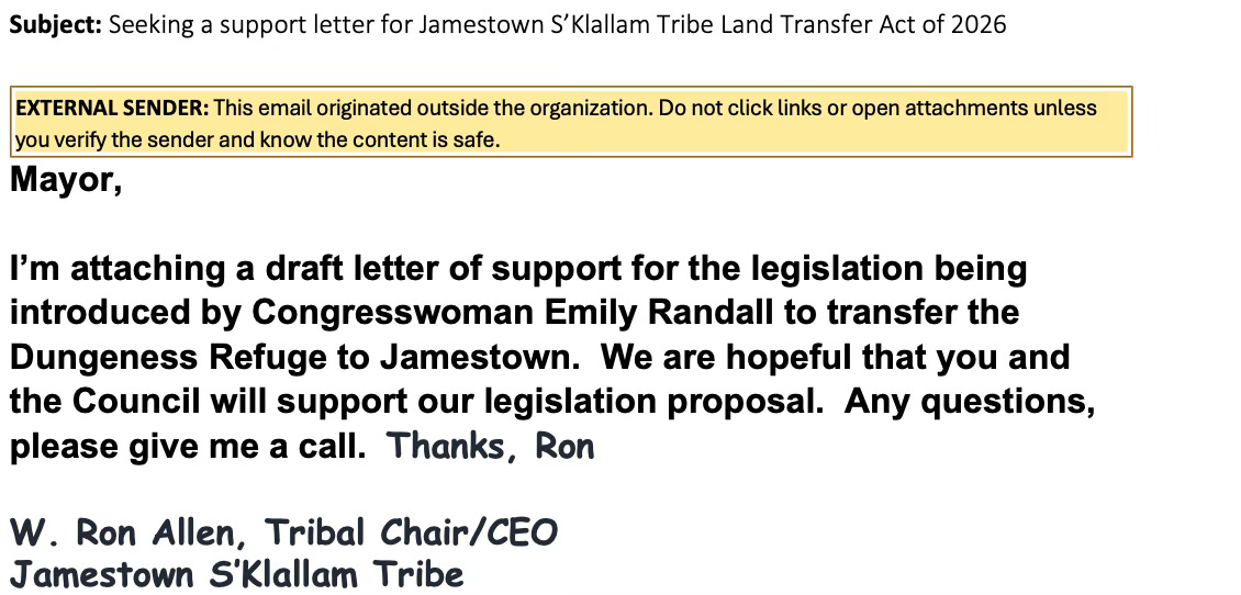 Public records show that on March 19, Jamestown S’Klallam Tribe Chairman/CEO Ron Allen emailed Mayor Anderson directly with a pre-written draft letter of support for federal legislation that would transfer the Dungeness and Protection Island National Wildlife Refuges into trust for the Tribe.