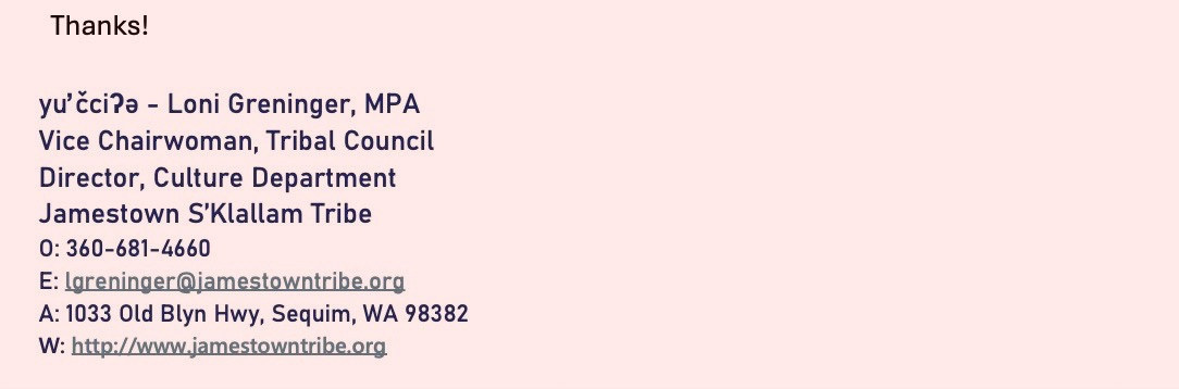 “I have had nothing but positive experiences interacting with the tribe. From the way that they do so much outreach to the community during times of public health crisis, during times of when folks need to access resources and all of the ways that they work to steward the the lands that we all have that we all are enjoying at this time. I I look forward to learning more and being curious and learn and receiving more resources and input before making any kind of decisions and in the most respectful way possible with the Jamestown tribe.”
