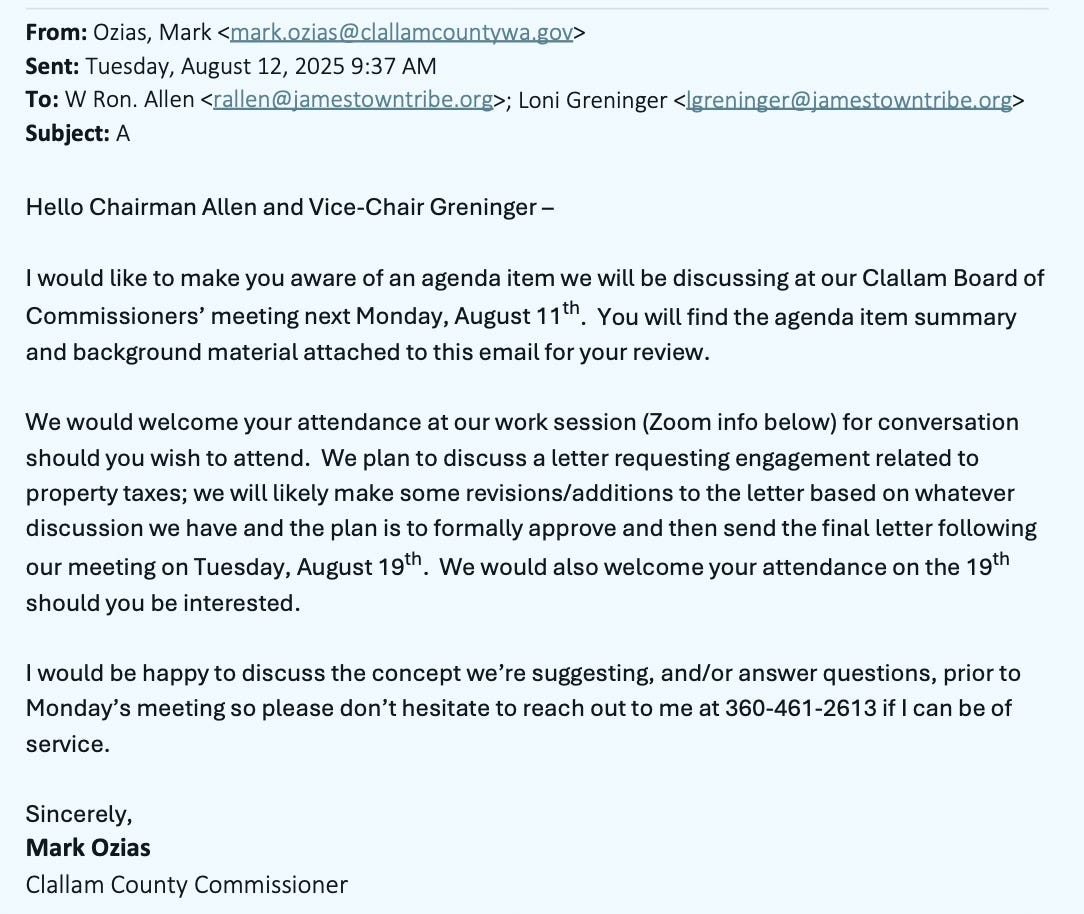 Last August, Clallam County Commissioners reached out to the Jamestown Tribe seeking a conversation about lodging and property taxes.
