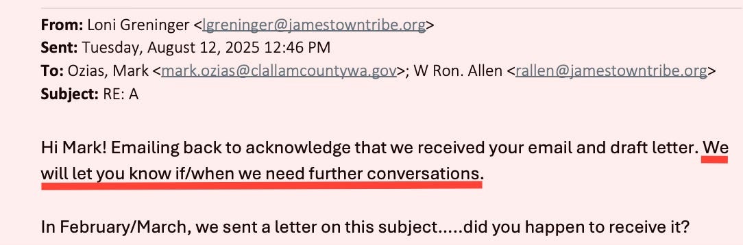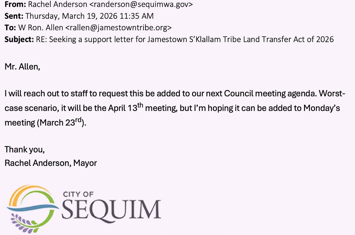 But when the Tribe asks for something—a letter supporting federal land transfer—Sequim leadership moves within hours to put it on the agenda.