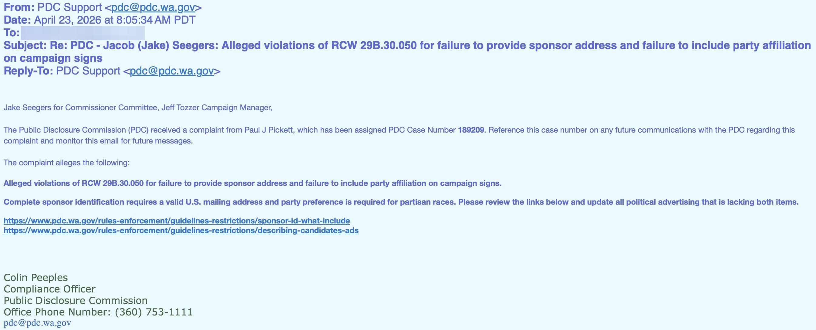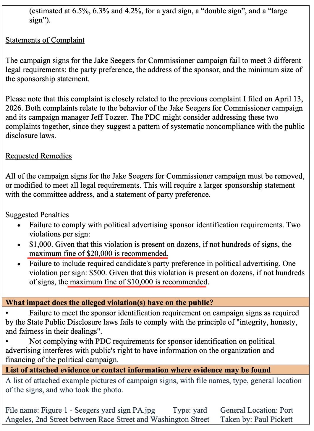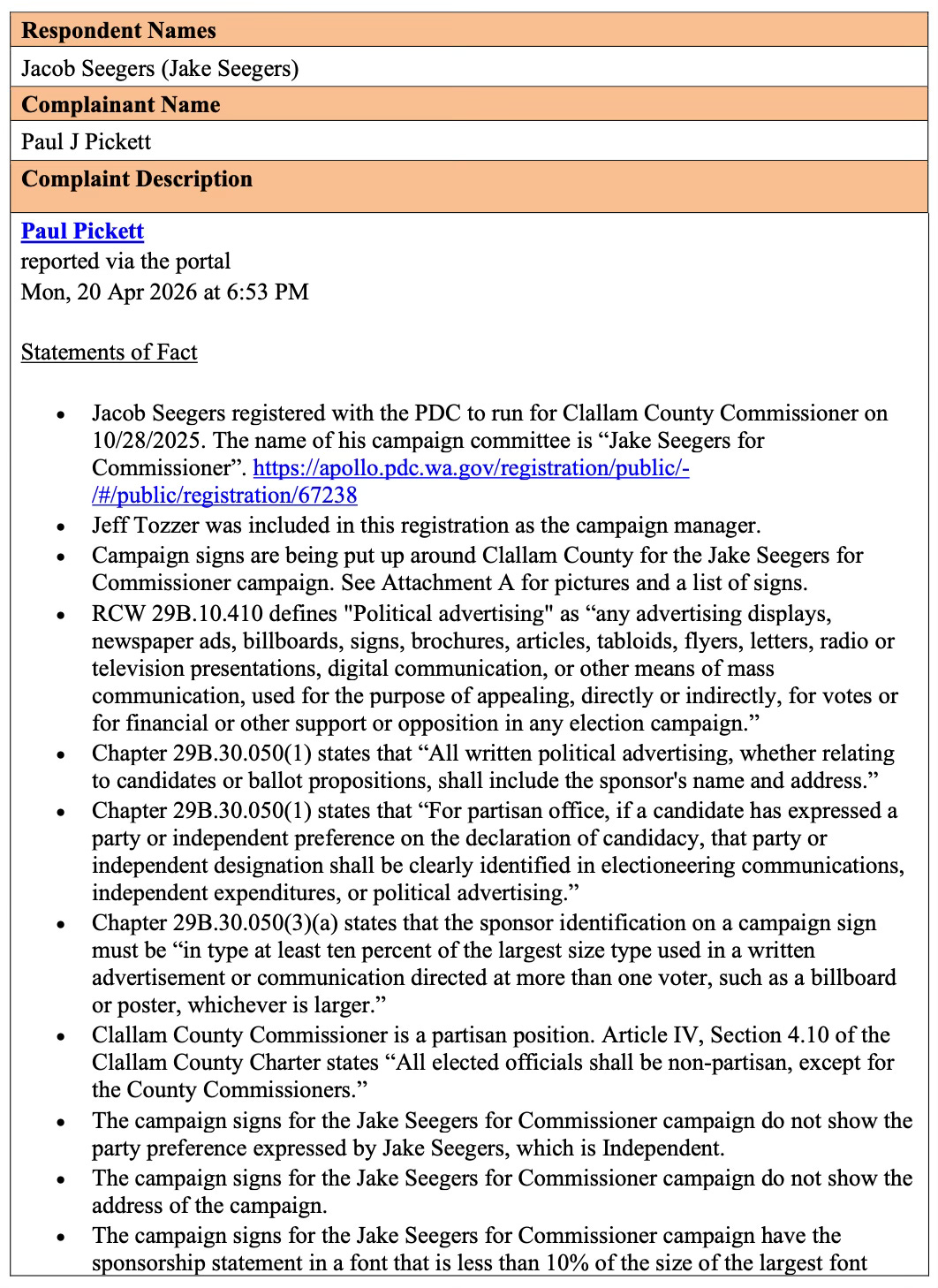 That same day, his opponent, Jake Seegers, was notified that a complaint had been filed with the Washington State Public Disclosure Commission (PDC)—one that seeks up to $30,000 in fines.