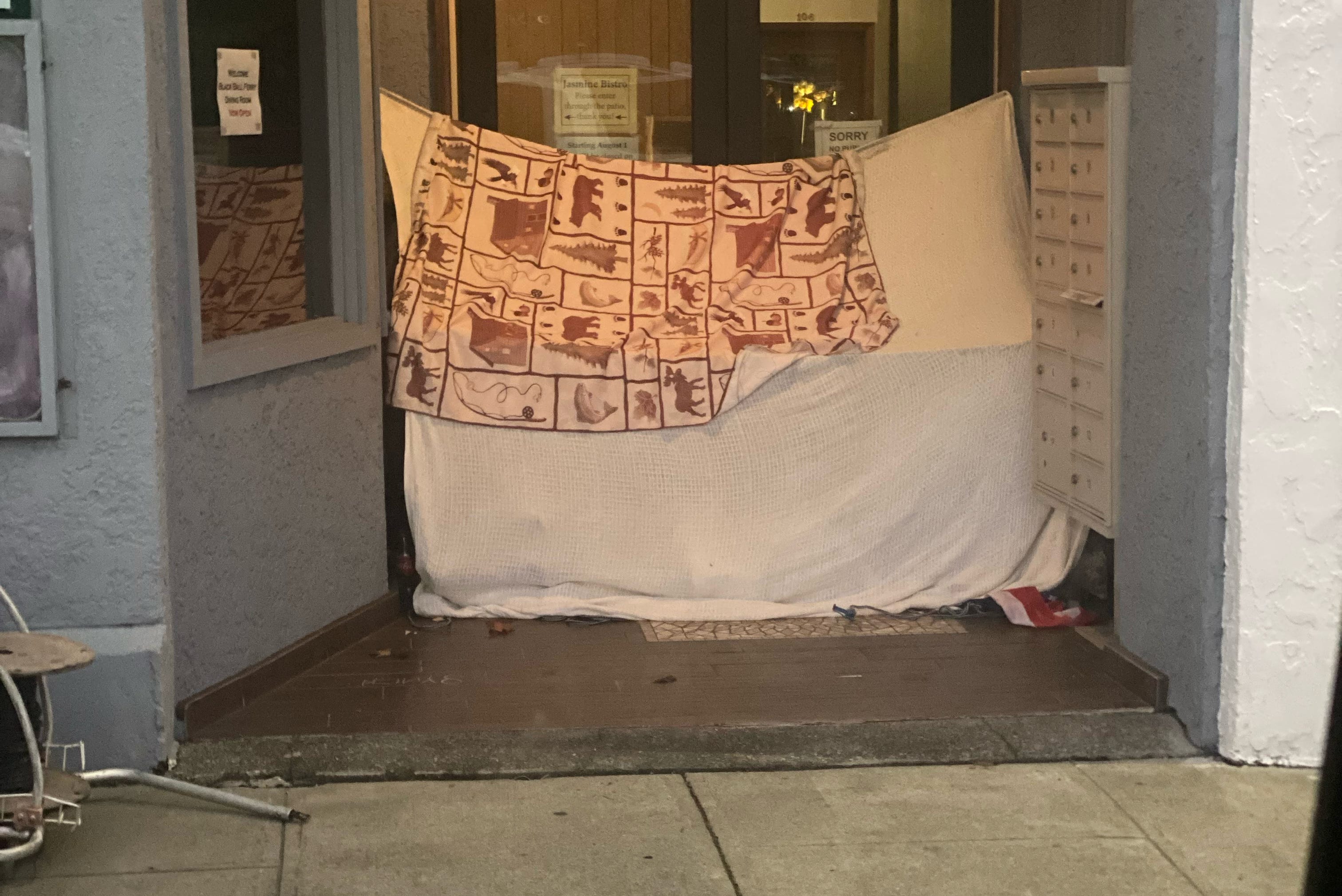 She described arriving to her building only to find her entrance blocked by tarps, bedding, backpacks, clothing, and two people—one slumped over, possibly under the influence.