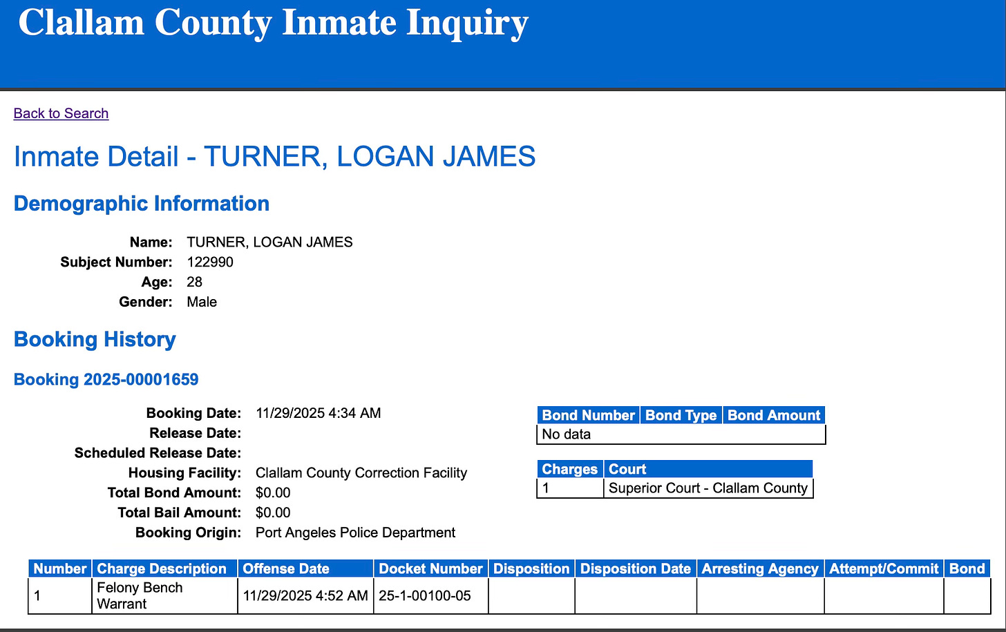Currently, the Clallam County Jail roster lists Logan James Turner, age 28, booked Saturday on a felony bench warrant. Turner is not a new name to law enforcement—but he is to Clallam County.