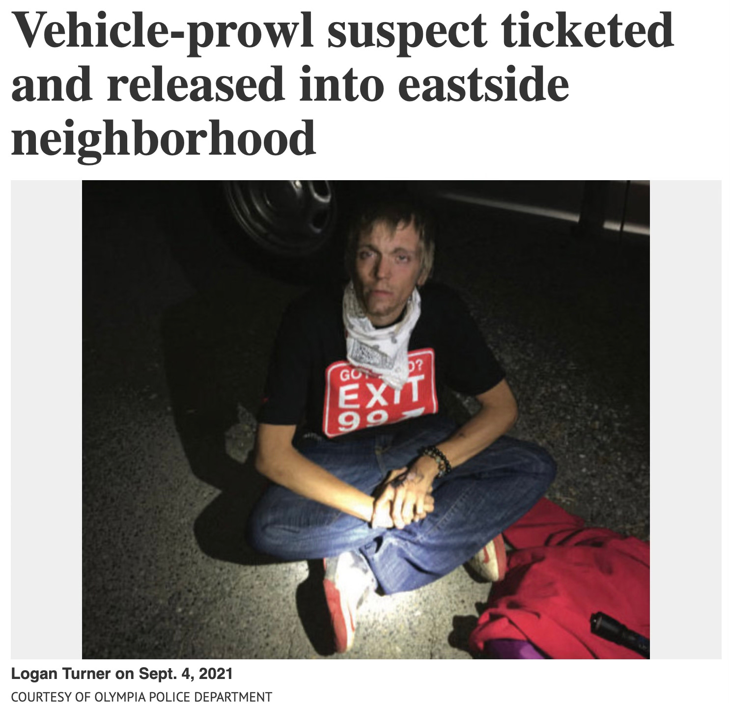 An Olympia officer found Turner leaning into a stranger’s truck. When asked what he was doing, Turner reportedly replied: “Honestly, yes.”—admitting to vehicle prowl on the spot.