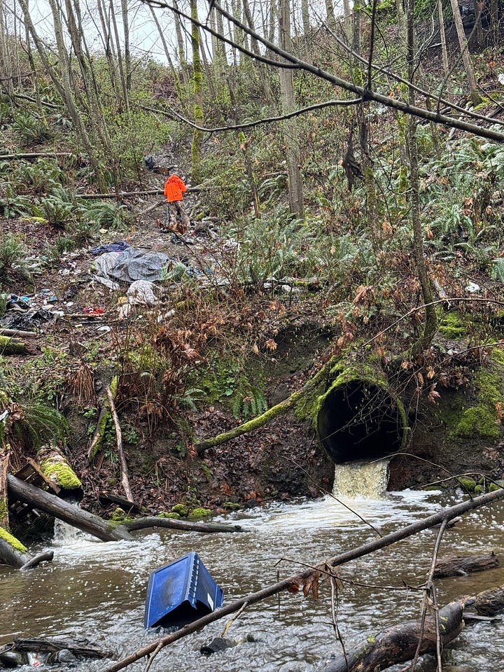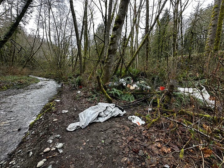 There, sections of the creek are being impacted by unmanaged encampments: human waste, discarded needles, space blankets, and other debris scattered through a sensitive habitat that should be protected.