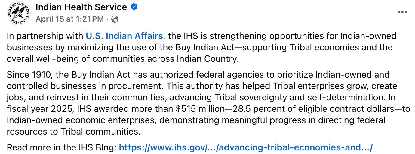 The Indian Health Service announced expanded efforts to support Indian-owned businesses through the Buy Indian Act, awarding over $515 million in contracts last year.