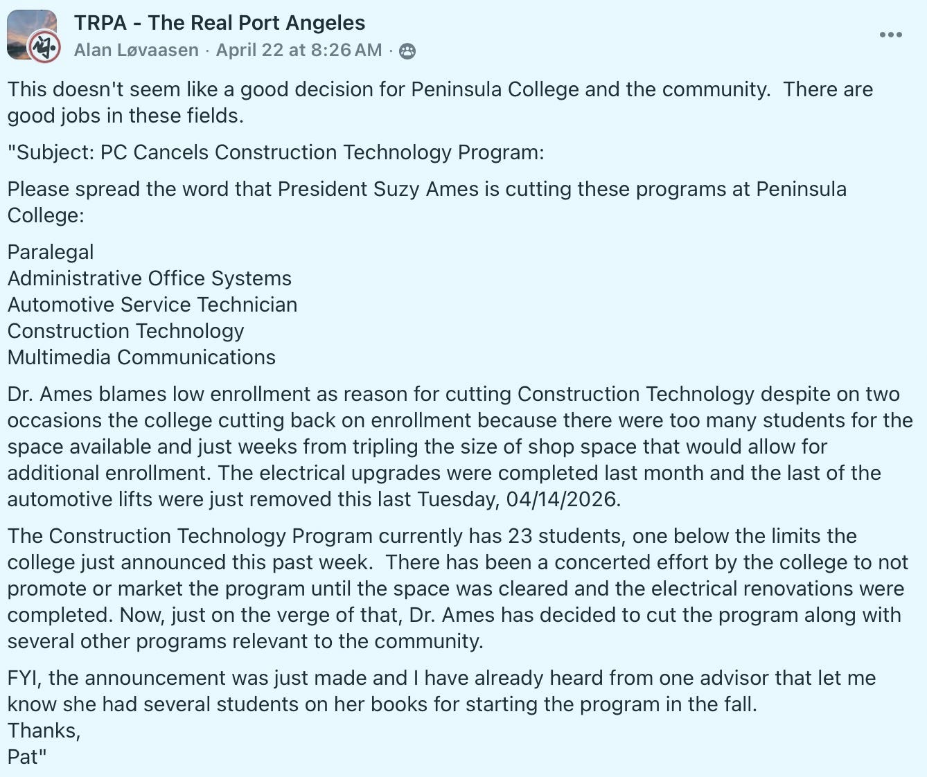 From Peninsula College weighing cuts to workforce programs while preserving electives, to public lands being overtaken or quietly transferred, and local officials navigating growing public frustration—this week’s stories highlight a recurring theme: decisions are being made, but not always in alignment with the needs of everyday residents. If you want to understand where Clallam County is headed, pay attention to what’s being cut, what’s being protected, and what’s being ignored.