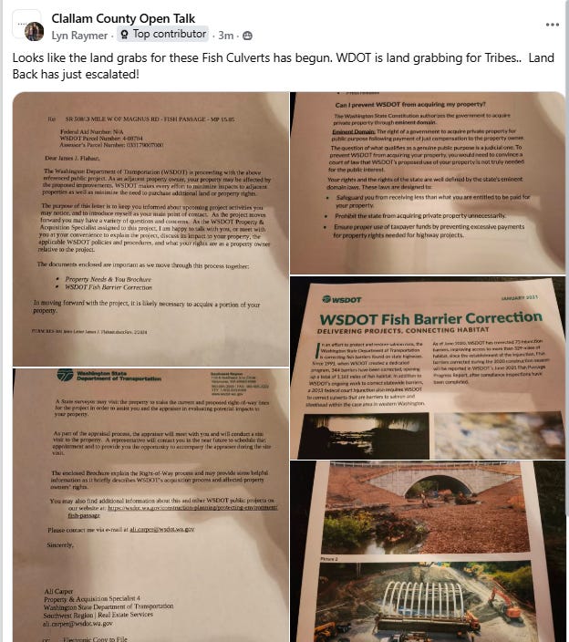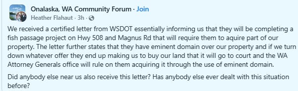 A post circulating in Onalaska, Washington has residents raising alarms after WSDOT indicated it may acquire private land for fish passage projects.