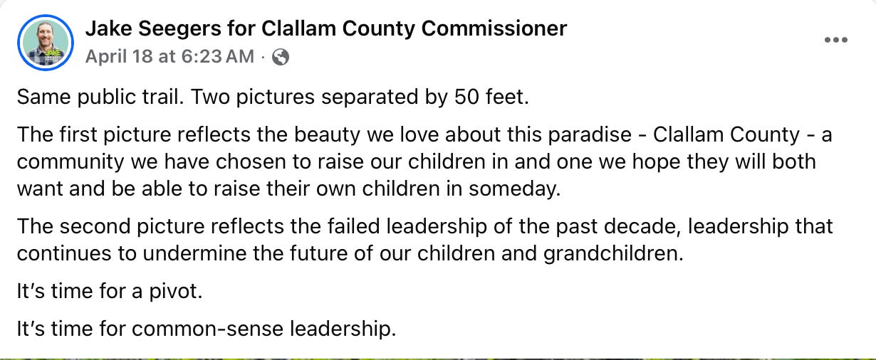 County Commissioner candidate Jake Seegers captured two images just 50 feet apart along a public trail.
