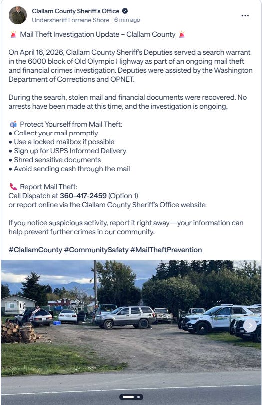 The Clallam County Sheriff’s Office recovered stolen mail and financial documents on April 16th from a long-troubled property on Old Olympic Highway in Sequim.