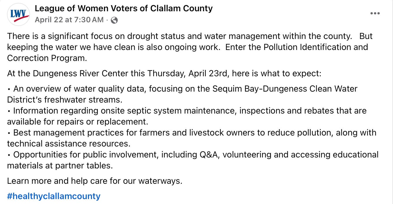 The League of Women Voters of Clallam County recently promoted a presentation with County Health and Human Services, the Jamestown Tribe, and the Clallam Conservation District focused on clean water—highlighting septic maintenance, pollution control, and protecting local streams.