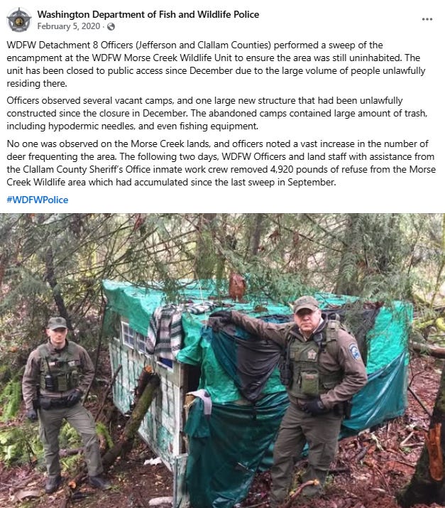 Washington Department of Fish and Wildlife officers recently cleared out an encampment at the Morse Creek Wildlife Unit after what they described as a “large volume” of unlawful residents.