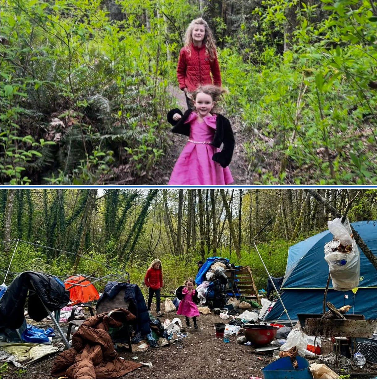 The other: a landscape overtaken by garbage, debris, and the impacts of unmanaged encampments.