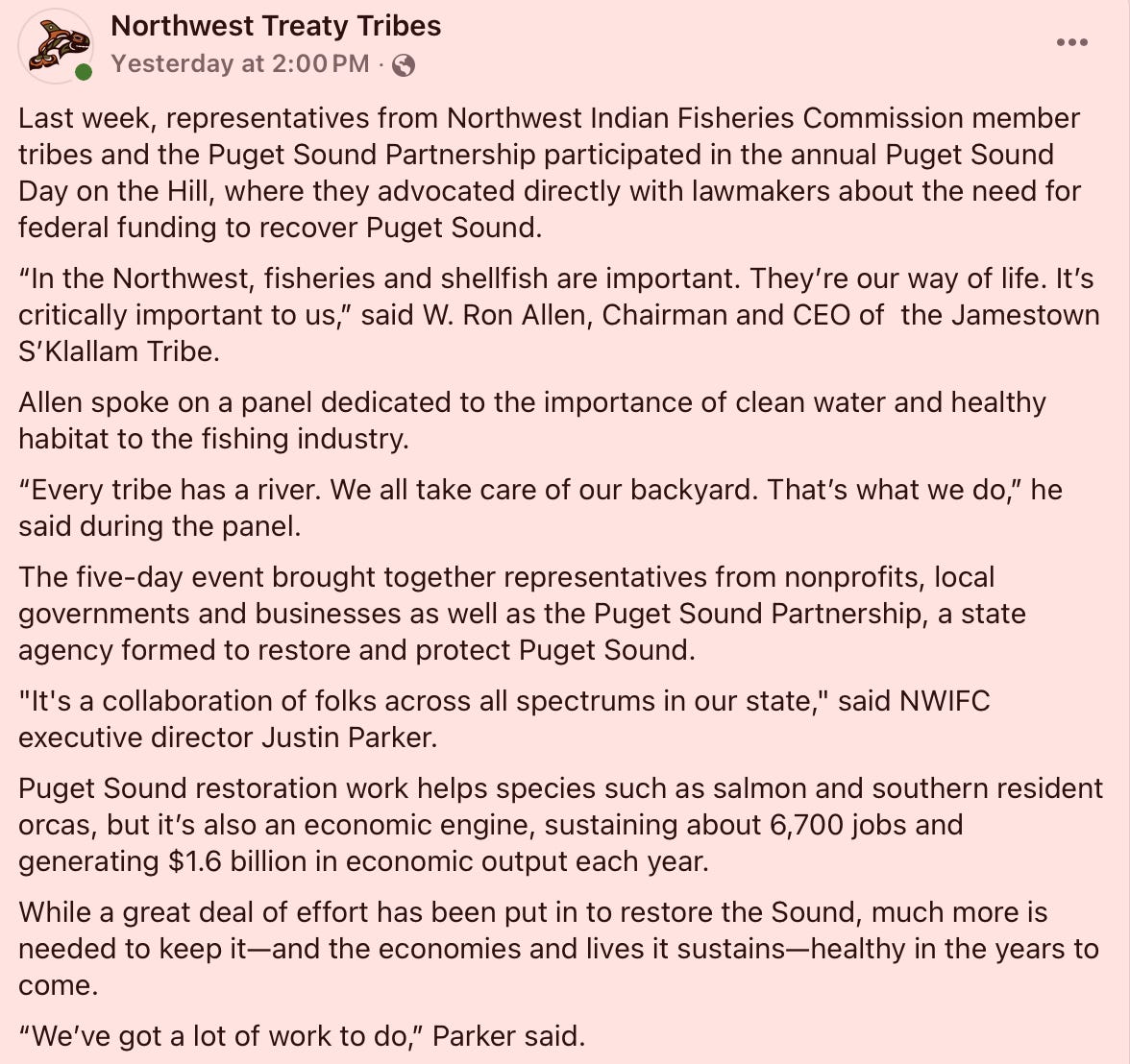 Jamestown Corporation CEO Ron Allen was in Washington, D.C. this week advocating for federal funding tied to Puget Sound restoration, emphasizing that shellfish and fisheries are “a way of life.”