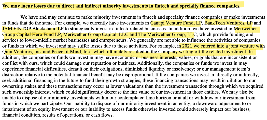 Back in 2021, a fintech joint venture with Quin Ventures and Peace of Mind, Inc. failed completely. The entire investment had to be written off.