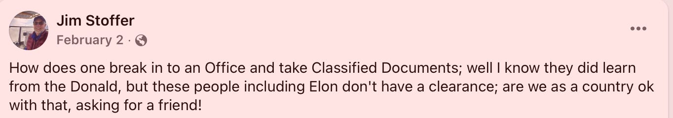 If there is one value Clallam County Charter Review Commissioner Jim Stoffer claims to hold above all others, it’s confidentiality. His social-media presence leaves no doubt: he routinely lectures national leaders about mishandling classified information, posting indignantly about “knuckleheads” who should be fired, locked up, or even sent to Guantanamo Bay for mishandling secret documents.