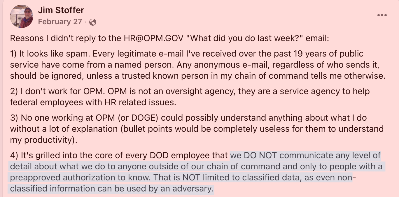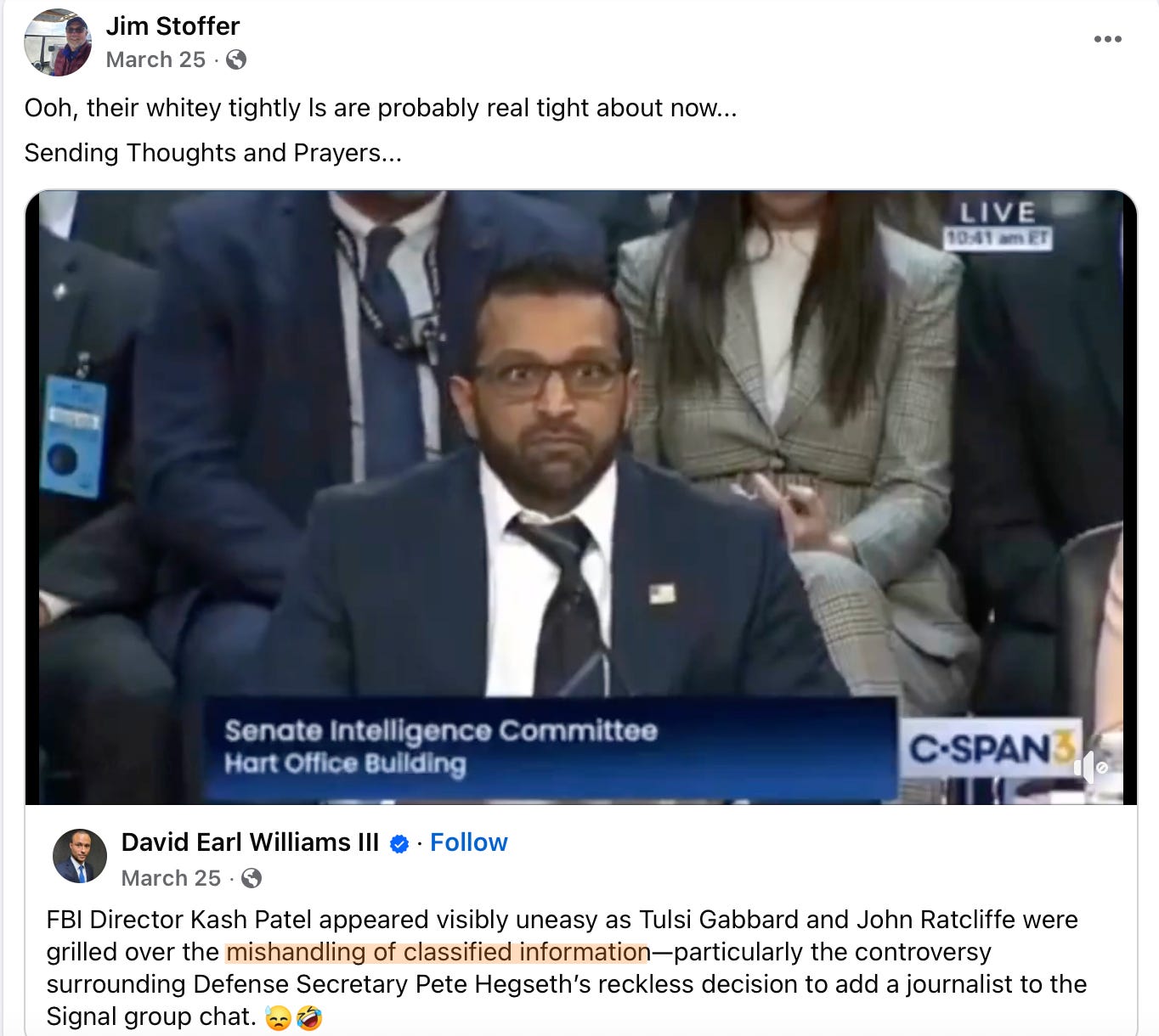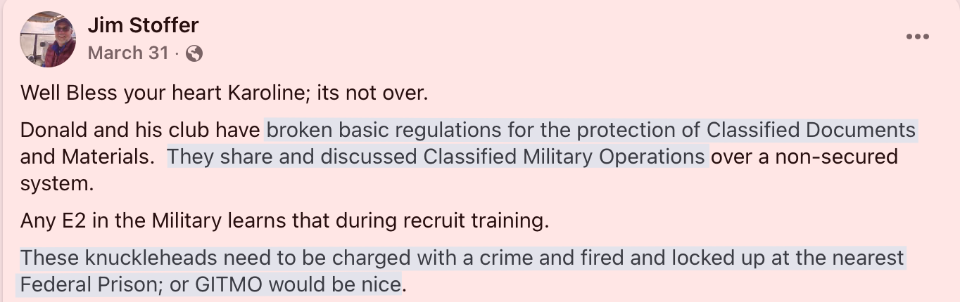 Drawing from his Coast Guard experience, Stoffer also reminded followers that those entrusted with sensitive information “DO NOT communicate any level of detail… to anyone outside our chain of command.” Even non-classified information, he stressed, can be used by adversaries.