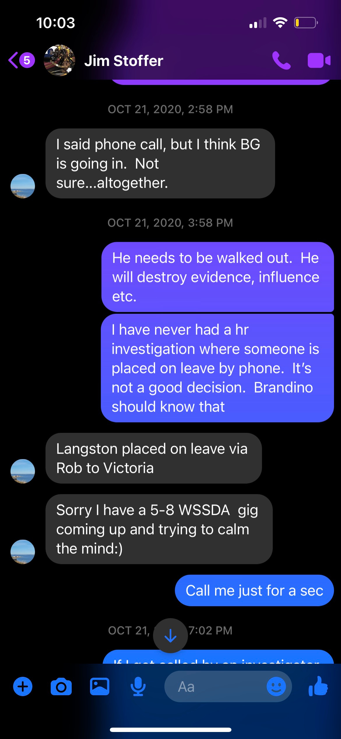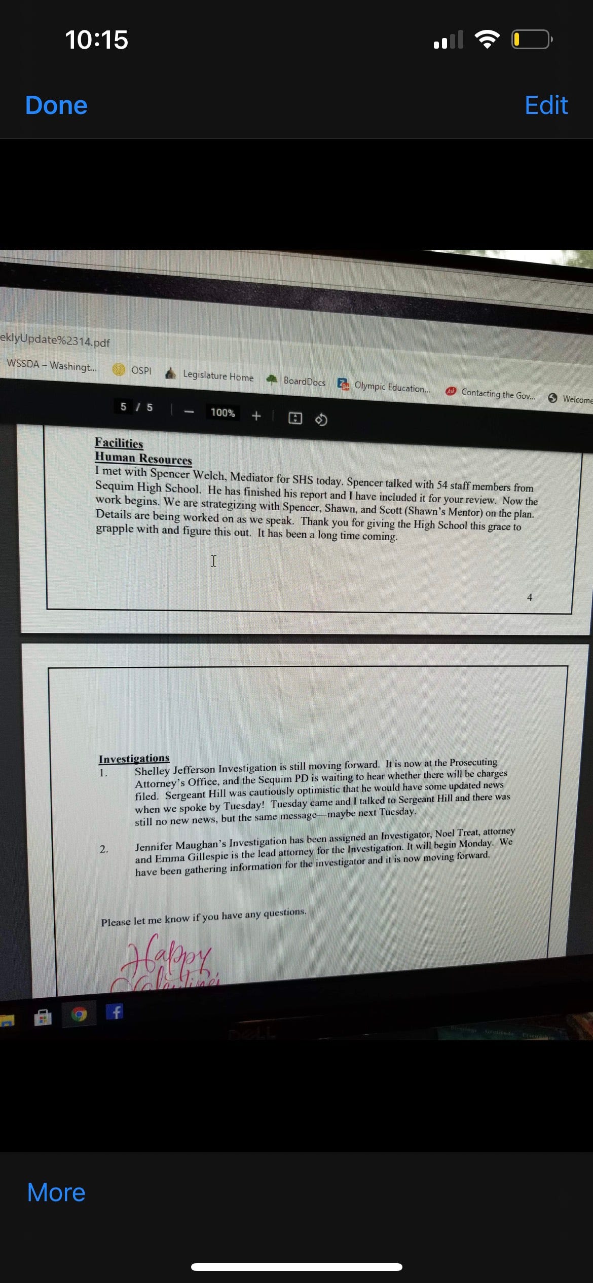 I sent an email and told the board and superintendent that Director Jim Stoffer provided confidential information to me over the past several years. I also stated that he allowed the Assistant Superintendent to take the fall for his actions. This was all true, but given Director Stoffer has not resigned for his unethical and unprofessional conduct, I can only assume it is because you need the proof, because without proof, it is just an accusation. Therefore, I am going to provide you a snippet of the information he provided to me over the years. Director Stoffer told me exactly when Superintendent Rob Clark was placed on leave, and he told me when Principal Shawn Langston was placed on leave (ExhibitD). I also have attached the copy of the mediator and mentor report regarding Principal Langston that was sent to the school board and Superintendent Jane Pryne.(Exhibit A&B) Director Stoffer sat in front of his computer and took pictures of it and sent them to me the same day he received the report. Director Stoffer would also send me Friday notes that Superintendent Pryne would provide only to the board as the notes were extremely confidential. (ExhibitC). Director Stoffer has not been honest and has allowed district employed women to take the fall for his unethical behavior. I chose to protect Director Stoffer last October because I truly thought he was trying to protect the women who were being sexually harrassed by Superinetendent Clark and Principal Langston. There are hundreds of screenshots, emails and text messages I am providing to Dan Gallagher for Hanna McAndie’s trial showing Director Stoffer believed the women and that he was doing something about it, but now I realize that just was not true. Our board members are elected officials and have a duty to be honest and ethical, Director Stoffer has not been. He has cost at least one SSD woman her job, reputation and livelihood and there are others pending. At what point is accountability, professionalism and ethical conduct a priority for this board? Director Stoffer should also understand that this email and proof is now on public record and searchable, which also puts me in jeporady, but intergrity is more important to me.