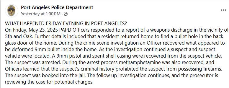 Last week, Port Angeles experienced a drive-by shooting near 5th and Oak. A bullet entered a residential home. A suspect was located, armed, carrying methamphetamine, and prohibited from possessing a firearm.