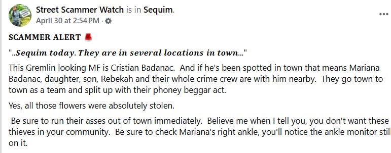 A Facebook warning recently went viral in Sequim, featuring a known scam crew led by Cristian and Mariana Badanac. The post described their coordinated panhandling and organized retail theft operations, reportedly involving multiple family members.