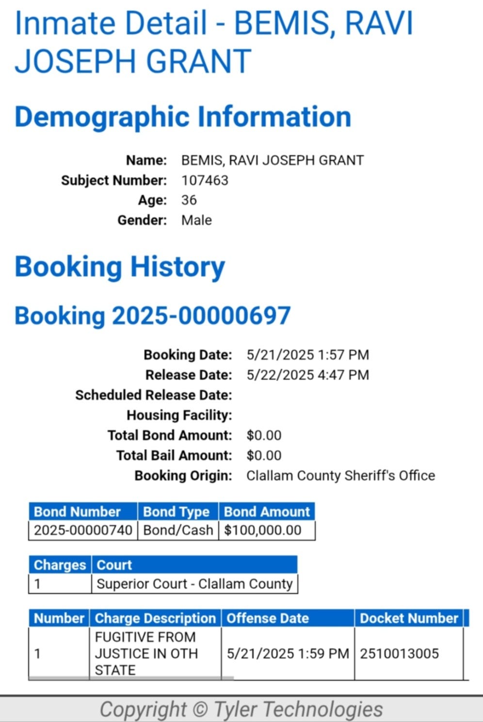 On May 21, 2025, Ravi Joseph Grant Bemis—originally from Lincoln City, Oregon, but currently residing in Sequim—was arrested for attempting to solicit sex from minors through decoy accounts.